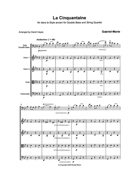 Gabriel-Marie: La Cinquantaine for double bass & string quartet (arr. Heyes)