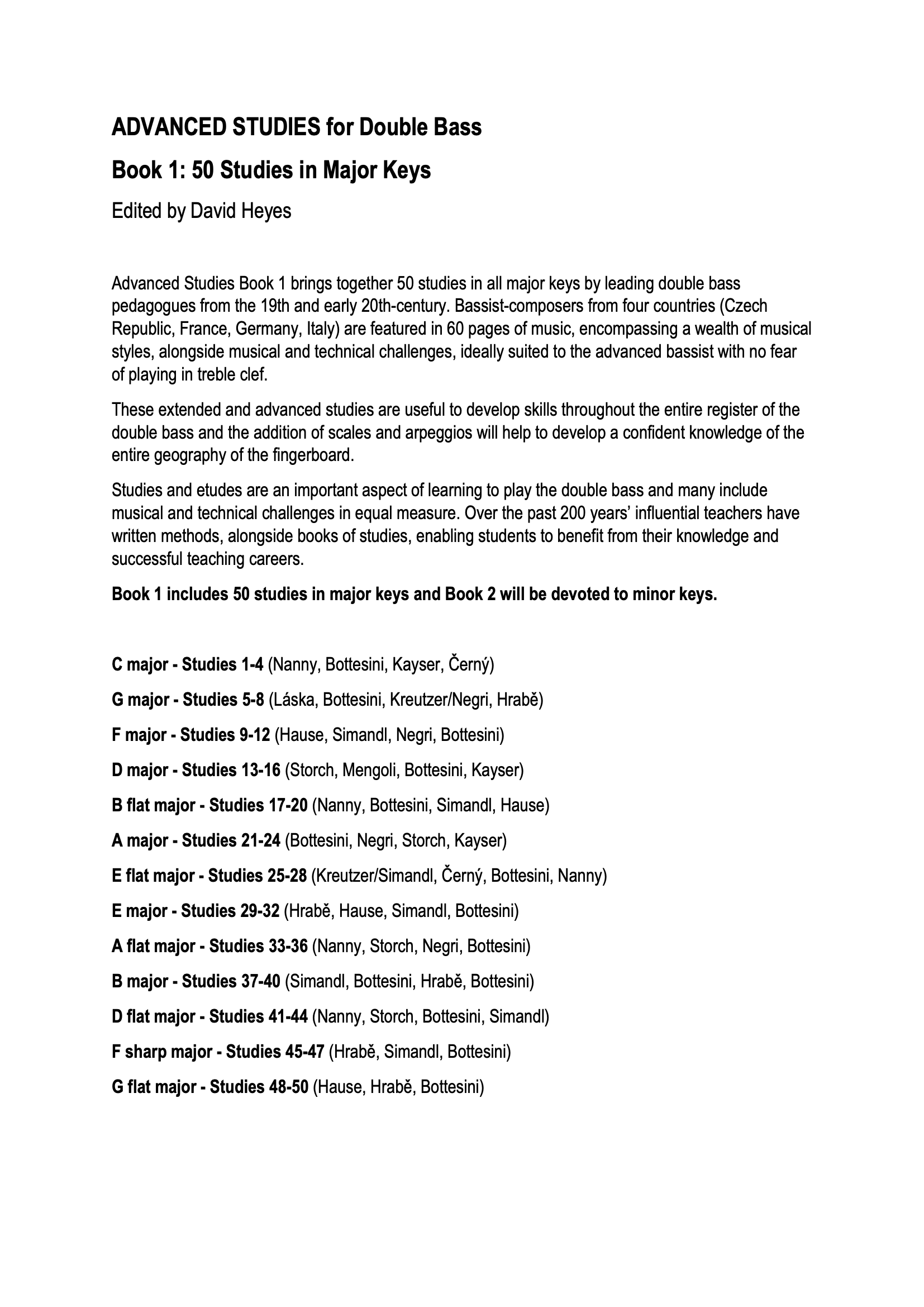 Advanced Studies Book 1 brings together 50 studies in all major keys by leading double bass pedagogues from the 19th and early 20th-century. Bassist-composers from four countries (Czech Republic, France, Germany, Italy) are featured in 60 pages of music, encompassing a wealth of musical styles, alongside musical and technical challenges, ideally suited to the advanced bassist with no fear of playing in treble clef.