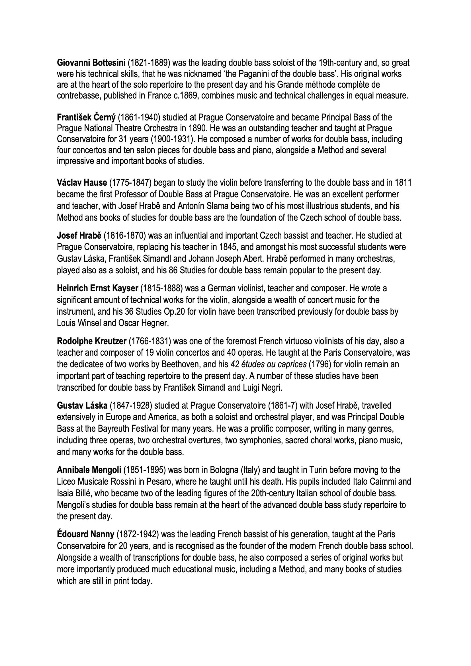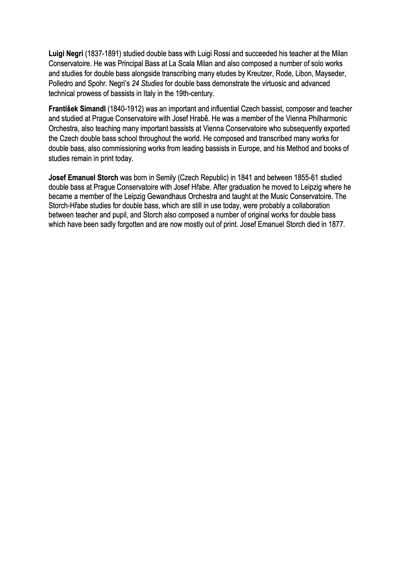 Studies and etudes are an important aspect of learning to play the double bass and many include musical and technical challenges in equal measure. Over the past 200 years’ influential teachers have written methods, alongside books of studies, enabling students to benefit from their knowledge and successful teaching careers.