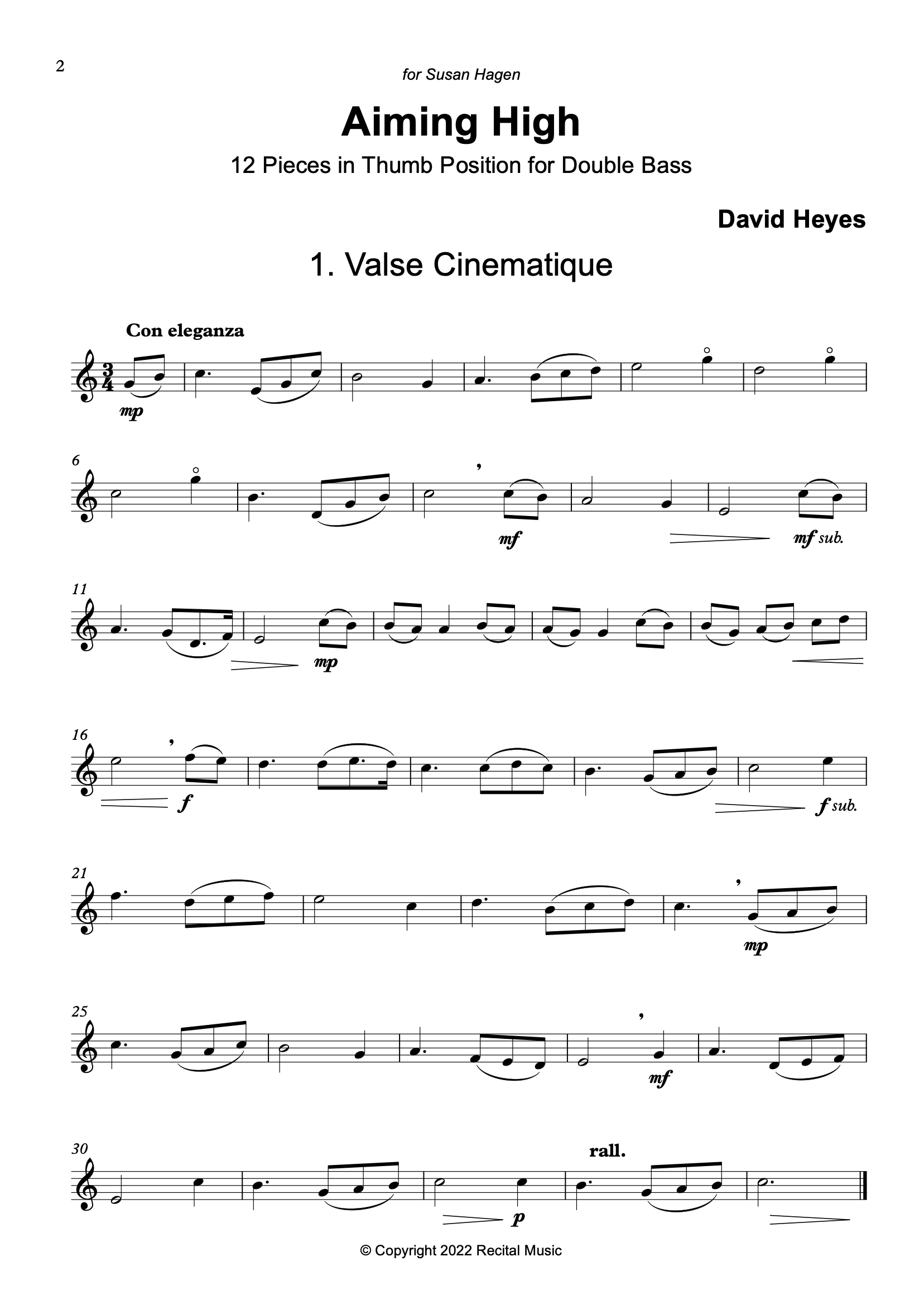 Aiming High was commissioned for her students by Susan Hagen (Berklee College of Music/Principal Bass, Boston Pops Orchestra) and builds on the technical skills acquired in Scaling the Heights, which focused on moving into and out of thumb position. It is suggested that the appropriate scale and arpeggio are studied alongside each piece.