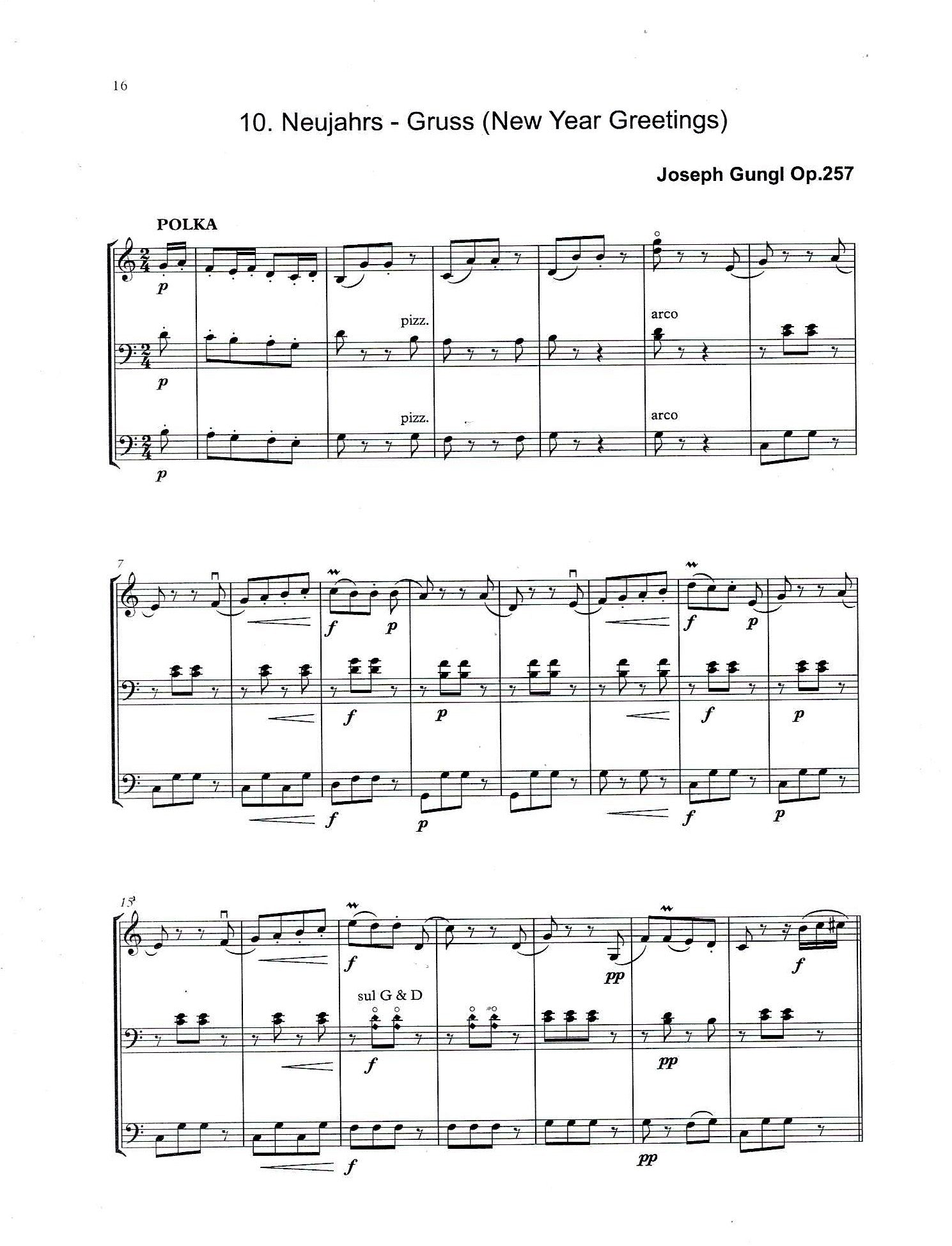 Joseph Gungl was a Hungarian composer, bandmaster and conductor. He was a prolific composer and wrote over 400 dances, including waltzes, mazurkas, quadrilles and polkas, and his music is characterised by long flowing melodies and rhythmic energy. New Year Greetings is a fast polka (Polka Schnell) abounding with bravura and restless energy and transcribes well for double bass trio.