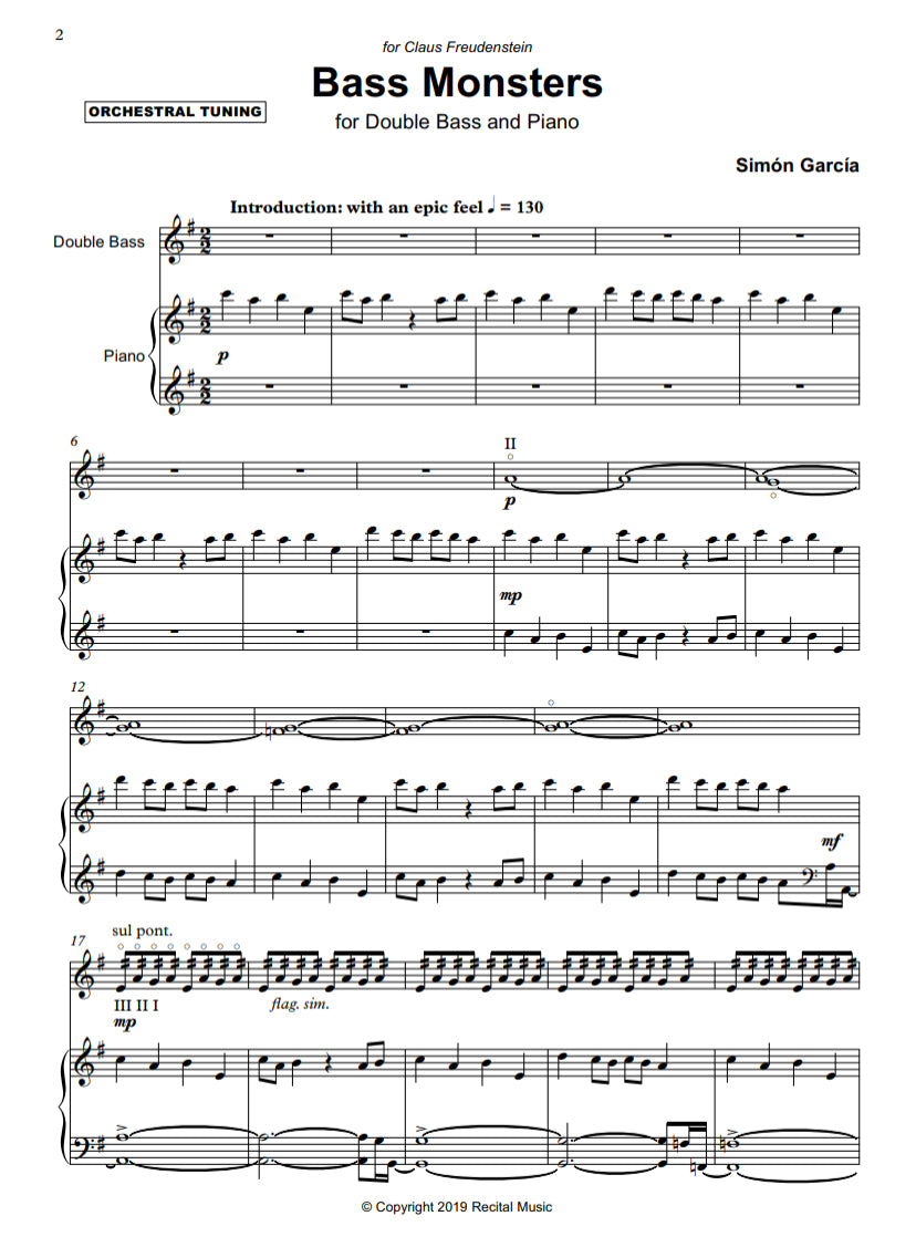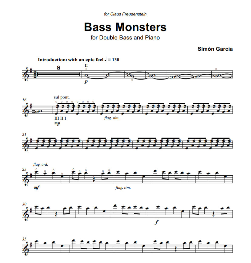 This edition includes piano accompaniments for both solo and orchestral tunings. Simón García writes: "Bass Monsters was commissioned by Claus Freudenstein, leader of the international double bass ensemble of the same name who play rock music as a double bass quartet. The piece begins with an introduction in epic style where, little by little, the music reaches a climax and from here the main piece begins, which was inspired by the British Heavy Metal 'Iron Maiden'.