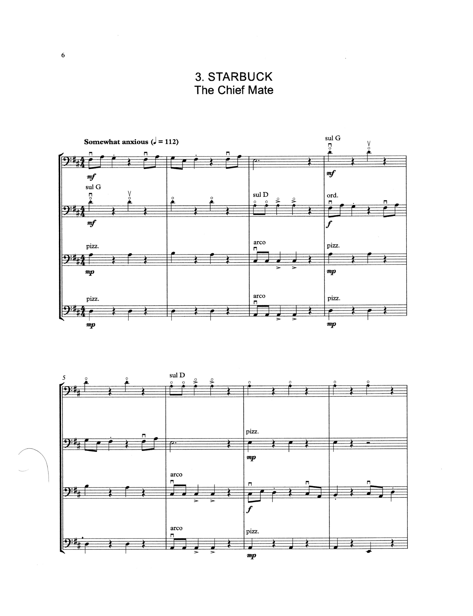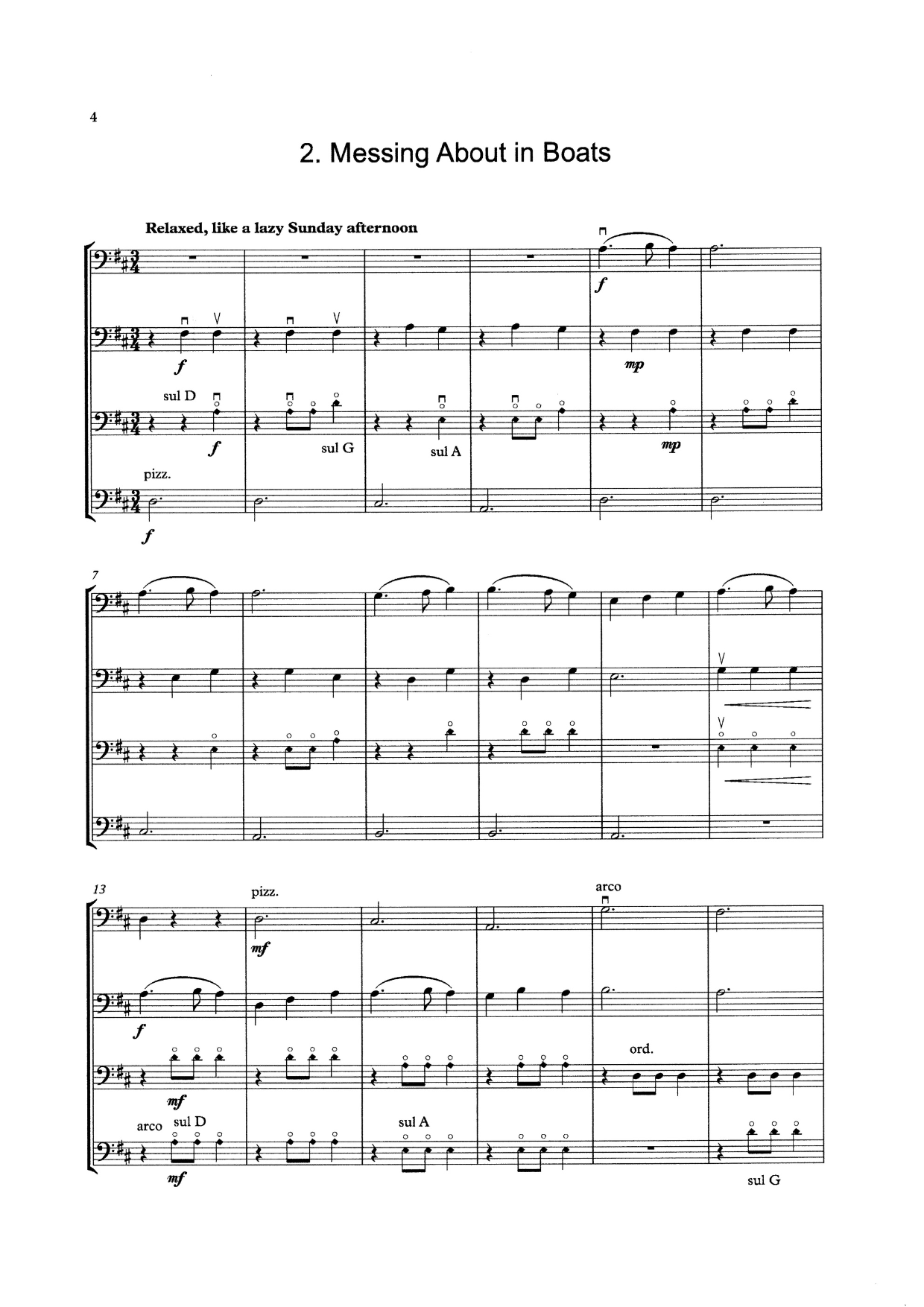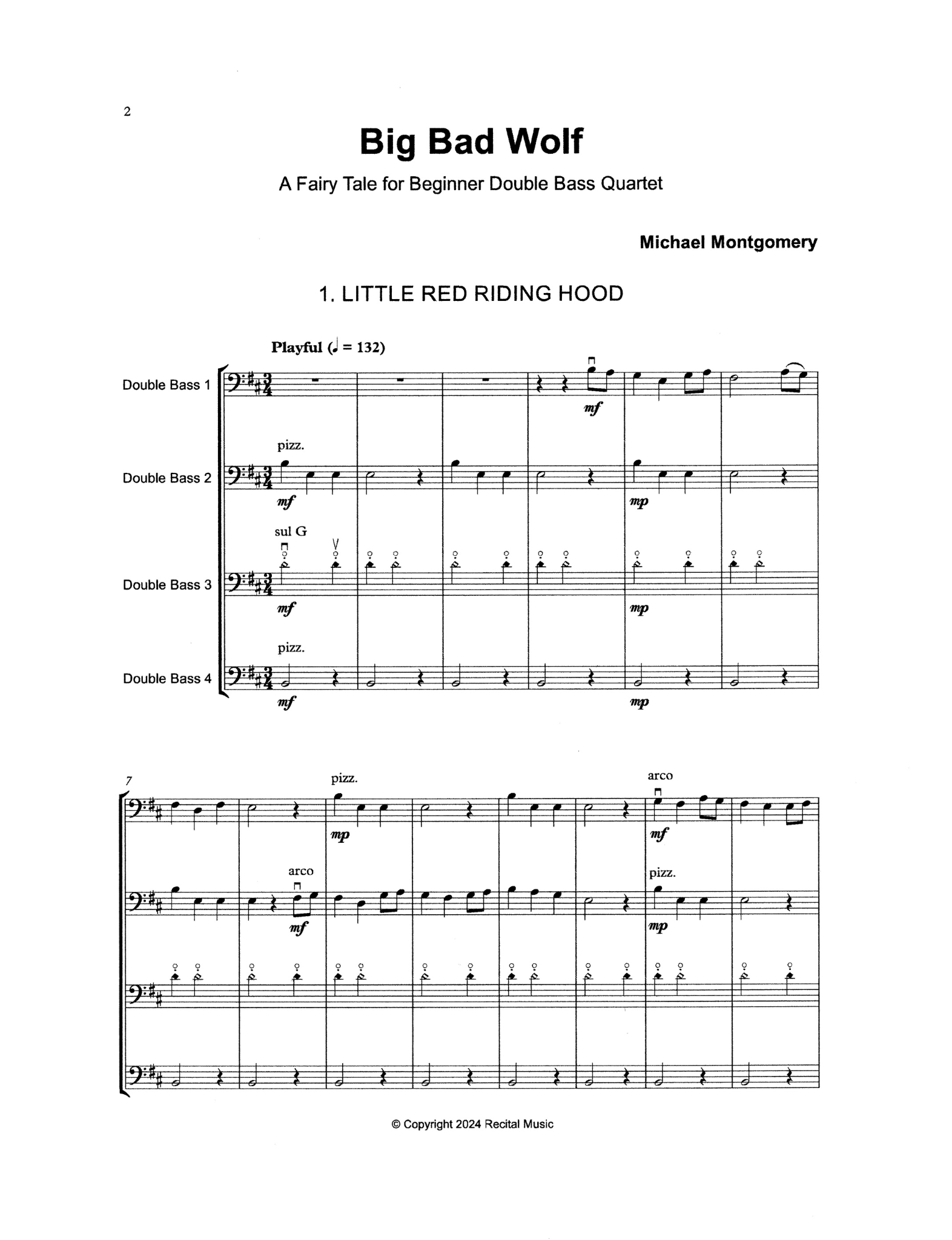 Mini-Bass Quartet No. 1 uses first and second position only, employing simple rhythms and dynamics, but also introducing young bassists to different playing techniques at an early stage of their studies.