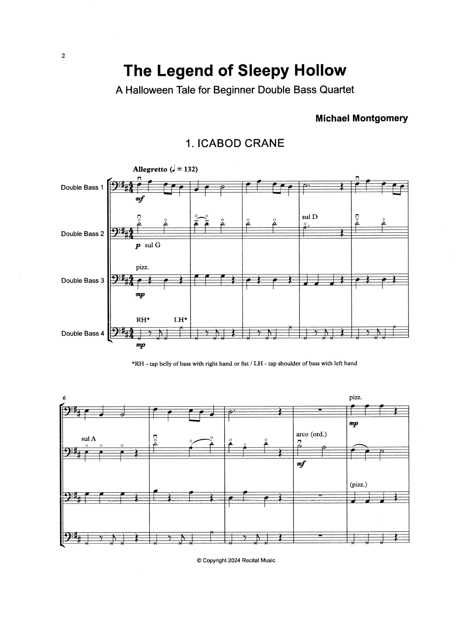 The Legend of Sleepy Hollow features five short, colorful and inventive pieces for the beginner bass quartet. Using only 1st position, alongside easy harmonics in 4th position to add height and clarity, alongside effective bass percussion, these pieces are an ideal opportunity to introduce chamber music from the earliest stages of study.