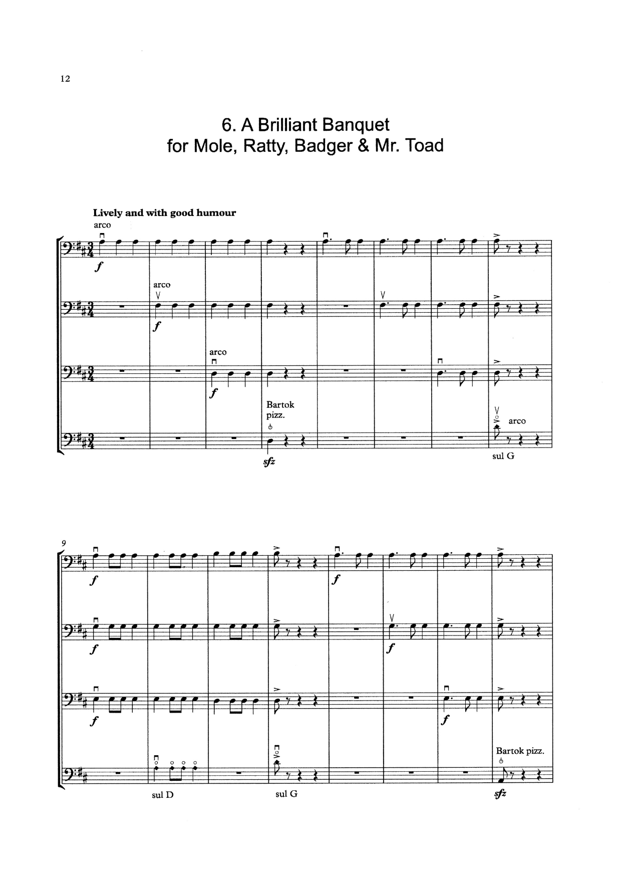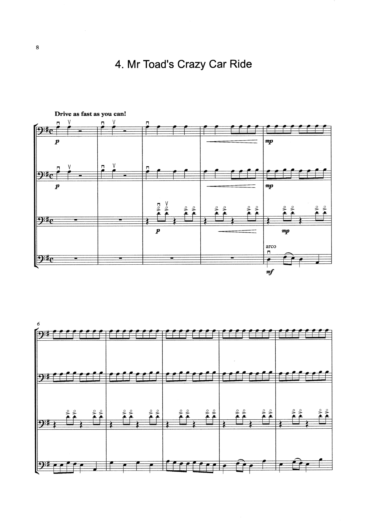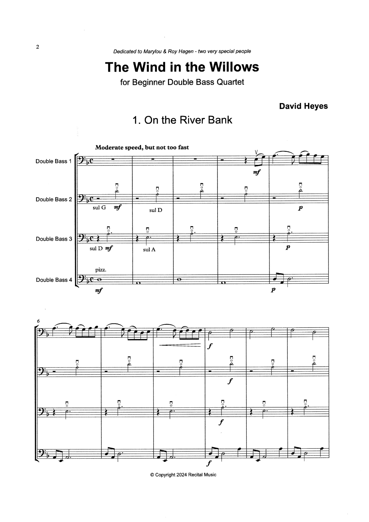 The Wind in the Willows is a suite of six fun and exciting pieces for the beginner double bass quartet. Primarily in 1st position, with a few easy harmonics in 4th position alongside interesting playing effects, a limited number of notes, rhythms and note values have been employed which are suitable for beginner bassists of mixed ability levels.
