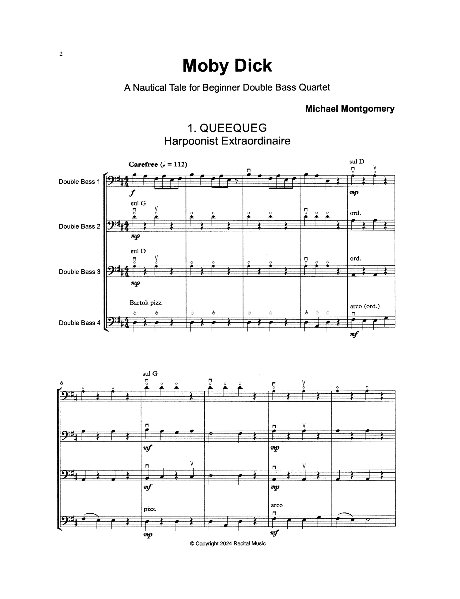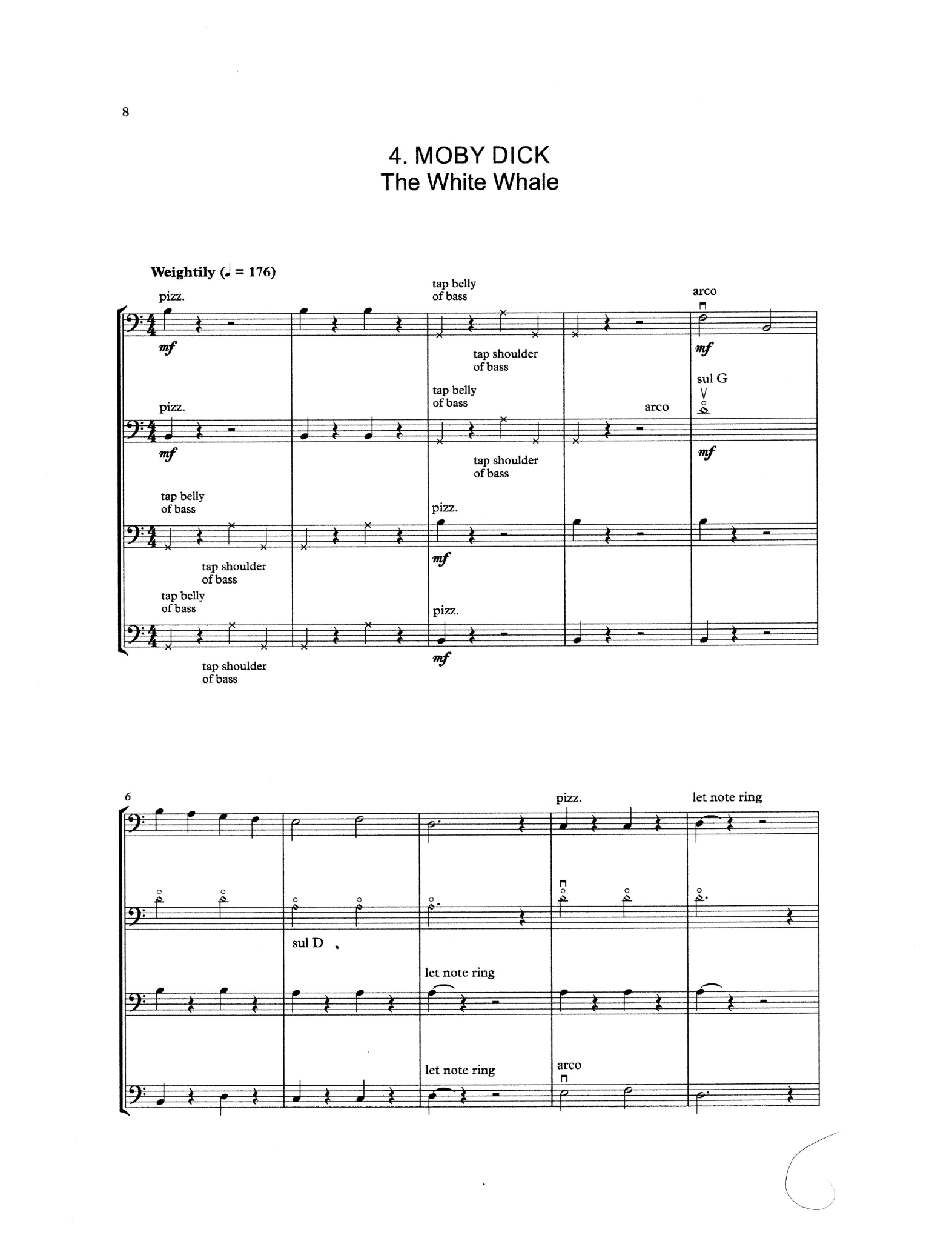 Moby Dick features five short and dynamic quartets for the beginner bass quartet. In 1st position throughout, apart from a few easy harmonics in 4th position to add height and clarity, these would be ideal for quartet or larger forces and the movements can be performed in any order.