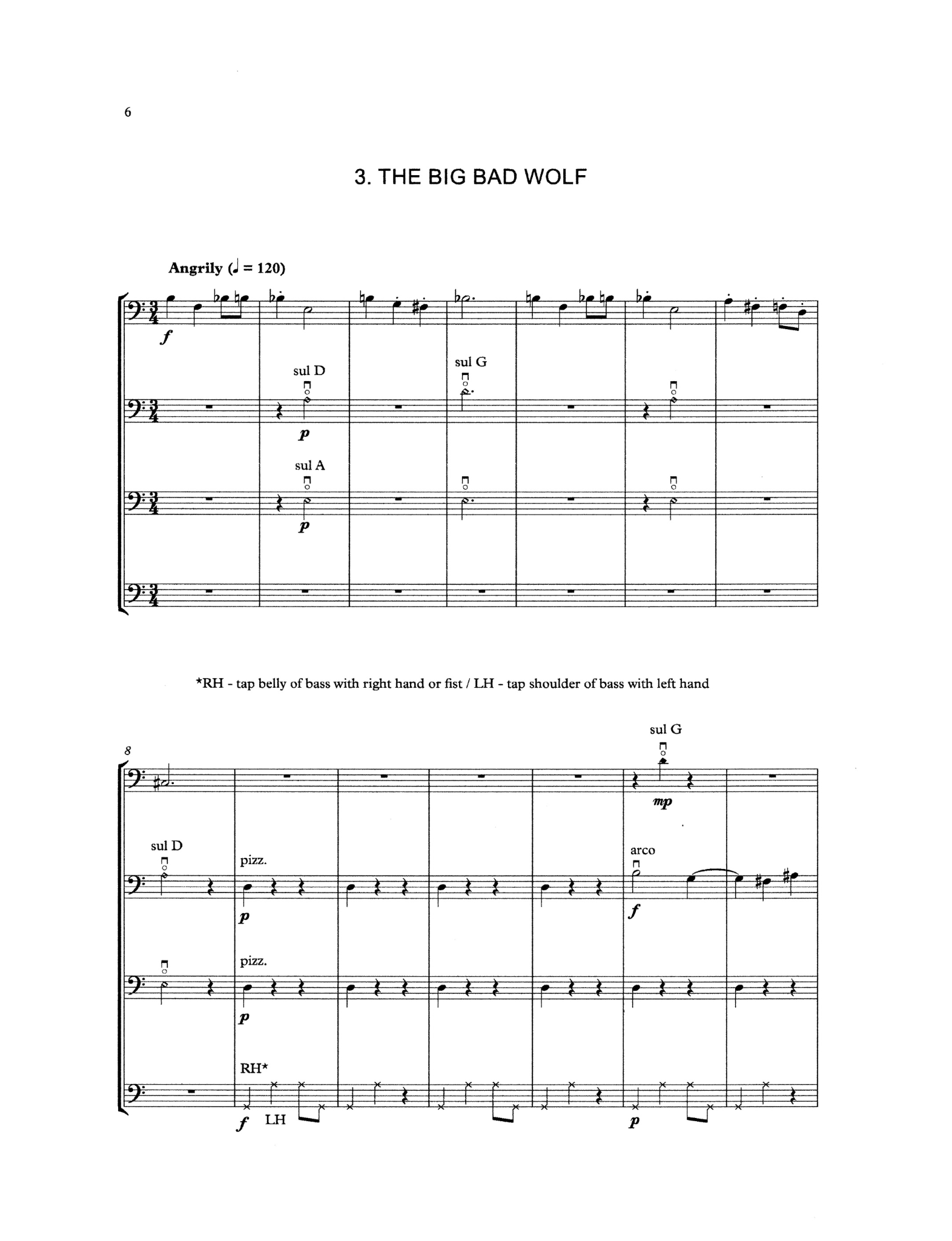 Big Bad Wolf is a fun collection of five colorful and inventive pieces for the beginner bass quartet, also playable with larger forces. Remaining in 1st position, with a few easy harmonics in 4th position to add height and clarity alongside effective bass percussion, these short quartets are an ideal introduction to chamber music for the youngest bassists.