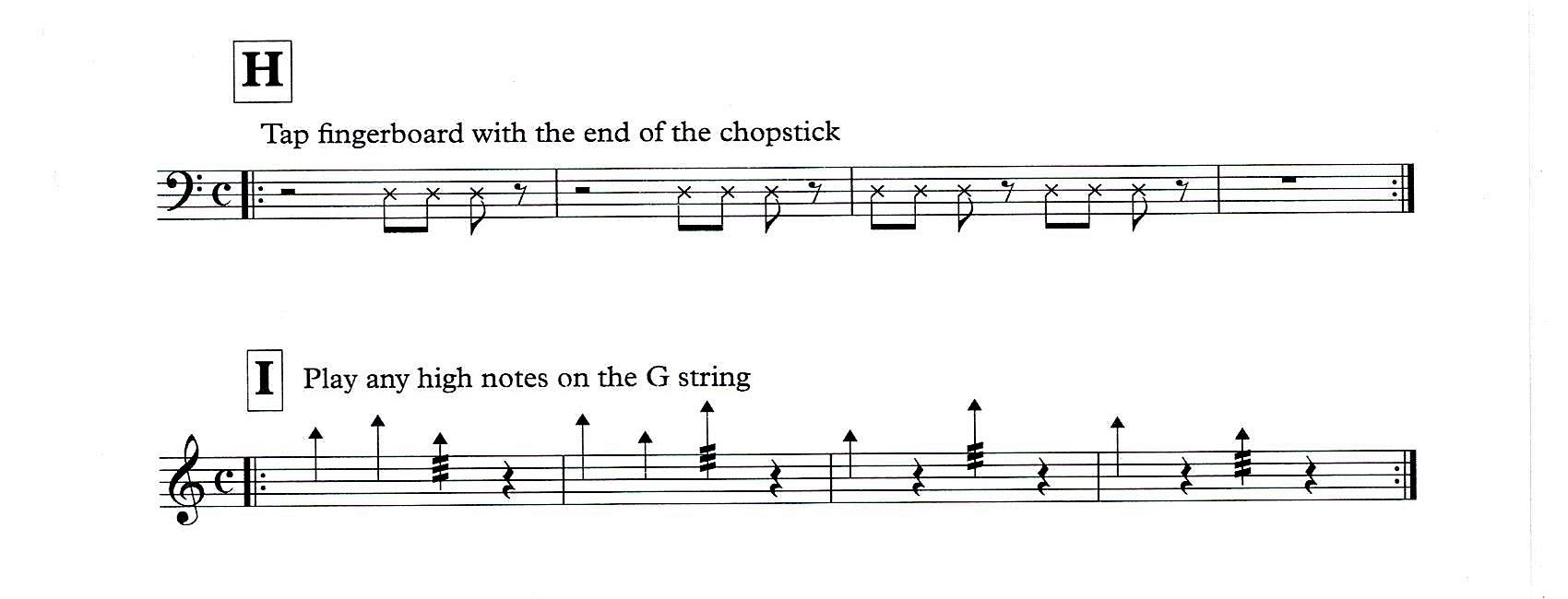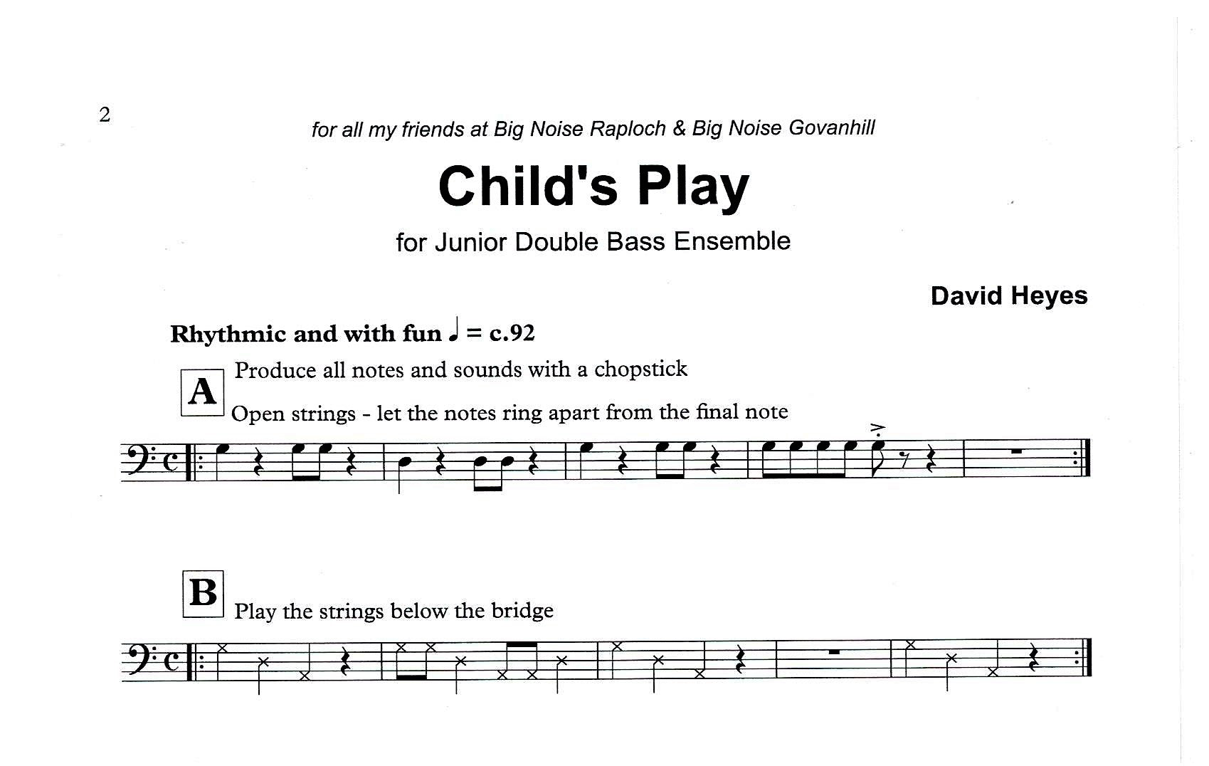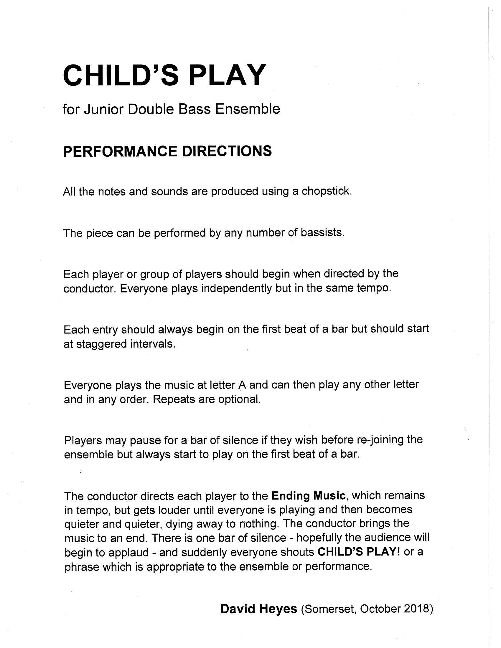 Child’s Play is a fun piece for bassists of all ages and abilities and is playable by any number of players. All the notes are produced using a chopstick (or pencil) and the piece is designed to explore the many different sounds and playing effects available on the double bass, alongside the skills of learning to work as an ensemble and to follow a conductor’s beat.