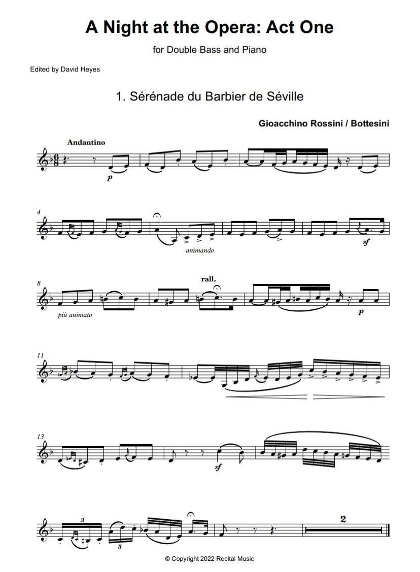 A Night at the Opera: Act One brings together six Italian opera arias for double bass and piano, arranged by Giovanni Bottesini. Four were included in Bottesini’s Method for Double Bass, to demonstrate the lyrical and melodic potential of the double bass, and two are from his original compositions.