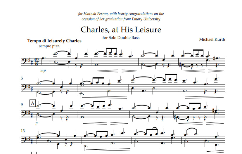 "Charles, at His Leisure" is a pretty little two-minute pizz solo with a lot of double and triple stops. They look pretty scary, but they all lie pretty well. I wrote it for a student of mine who has a bass named Charles.