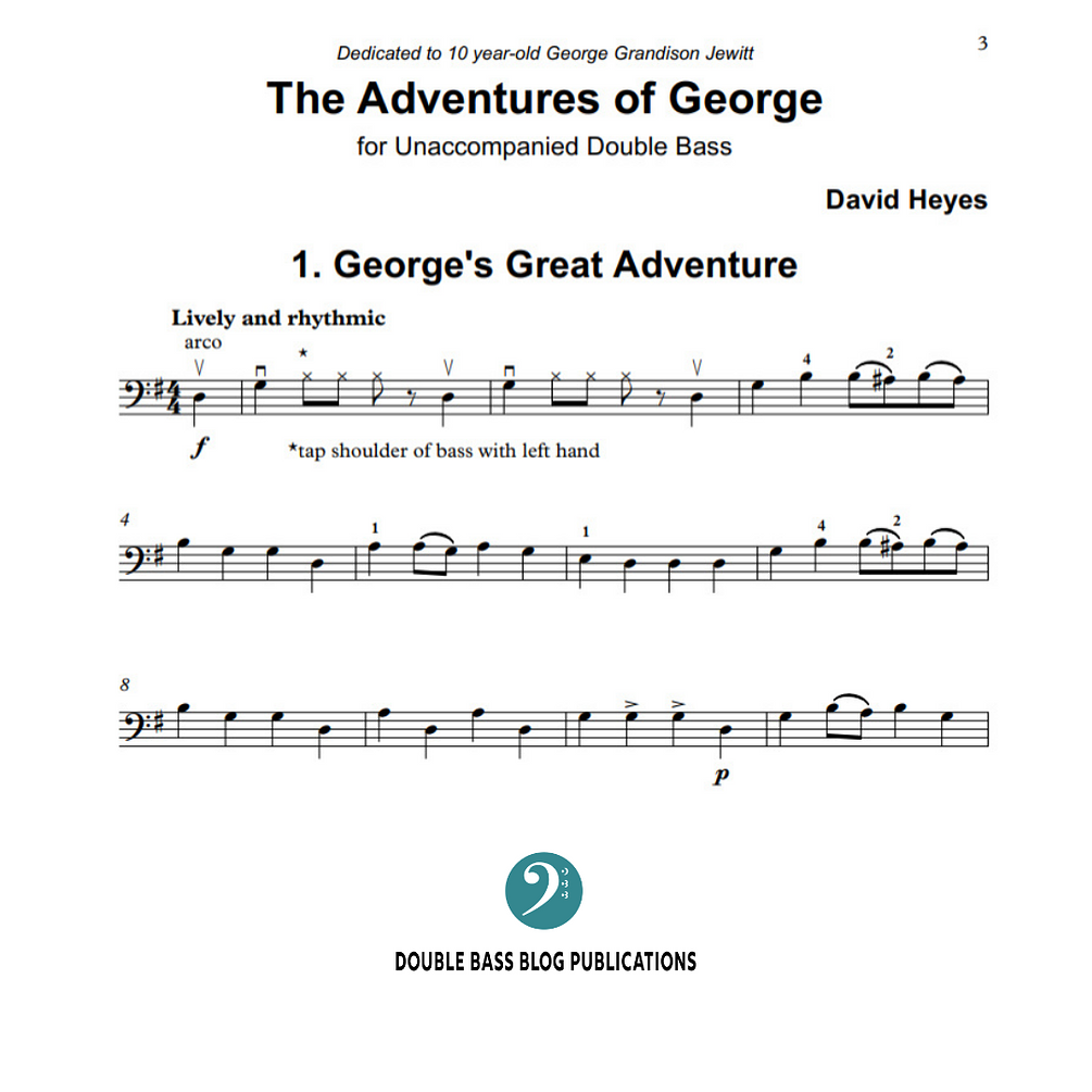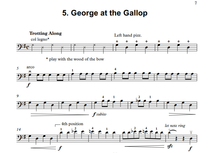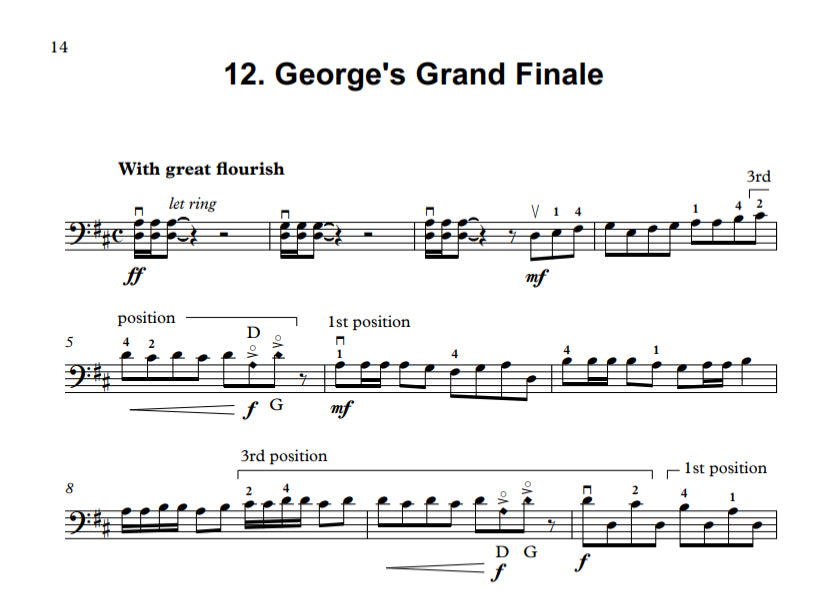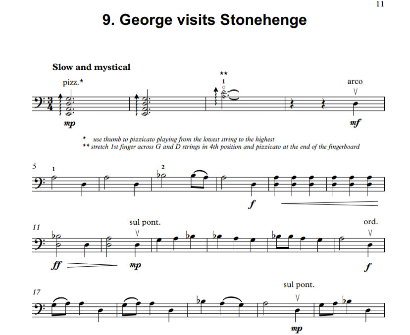 The Adventures of George is a suite of engaging pieces for the beginner bassist. A wealth of playing techniques are introduced to add variety and contrasts, including col legno, sul ponticello, bass percussion, left-hand pizzicato, Bartok pizz, simple harmonics, double stops, and much more. 1st and 4th positions are used primarily, followed by 2nd, 3rd, and half positions, and each short piece is colorful and innovative, introducing something new to enthuse and instruct in equal measure.
