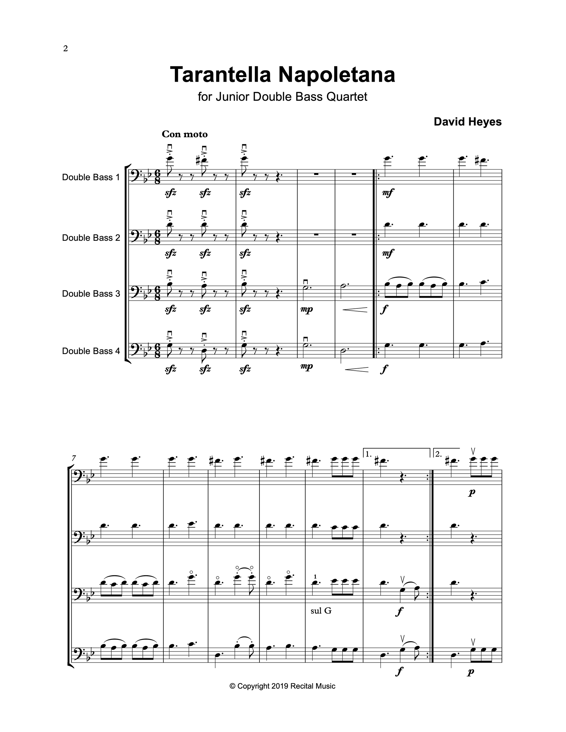 Tarantella Napoletana was composed for younger students to play in 'Bottesini Bravura!' The concert celebrated the music of Giovanni Bottesini (1821-1889) and this quartet was composed in an Italianate style and tailored to suit a specific ability level. The music is fast and lively, with a lyrical middle section and a short cadenza for bass 1 accompanied by a tremolando chord, which leads into an exciting and vibrant finale.