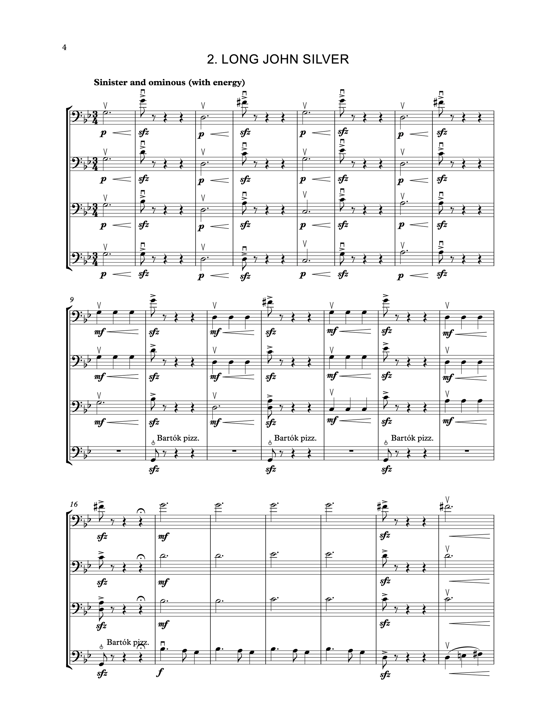 Treasure Island is a five-movement work for the progressing young double bass quartet or ensemble. It remains in bass clef throughout, bass 4 plays only in first position, and a number of performance effects such as sul ponticello, Bartók pizz., harmonics and ‘seagull’ are used to add character and variety.