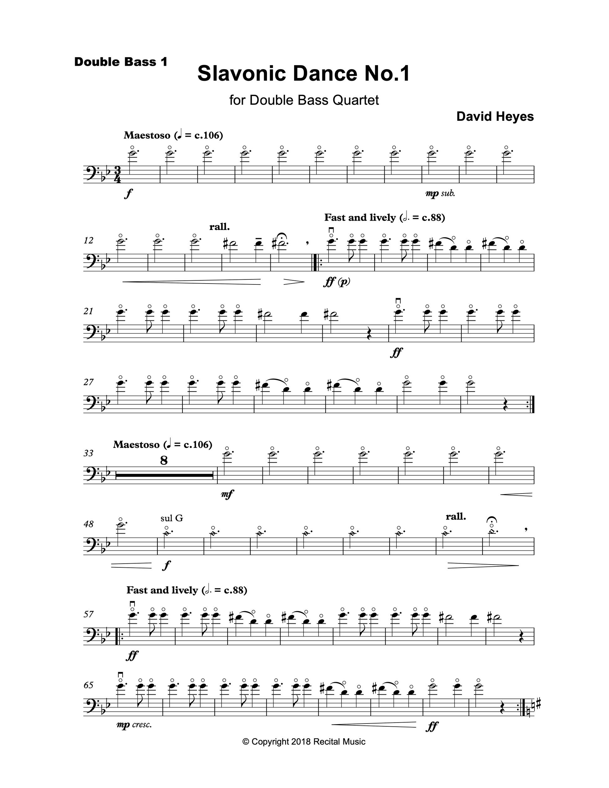 Slavonic Dance No. 1 a fun, lively and rhythmic piece with plenty of action and energy to keep everyone happy, written for the junior-intermediate double bass quartet or ensemble. The keys of G minor/major, alongside changes of tempo and mood with melodic interest shared between the players, creates a piece which has an educational aspect but also an audience and player appeal. Slavonic Dance No.1 is colorful and energetic, lyrical and evocative, offering effective musical and technical challenges and an ideal final concert work. It remains in bass clef throughout.