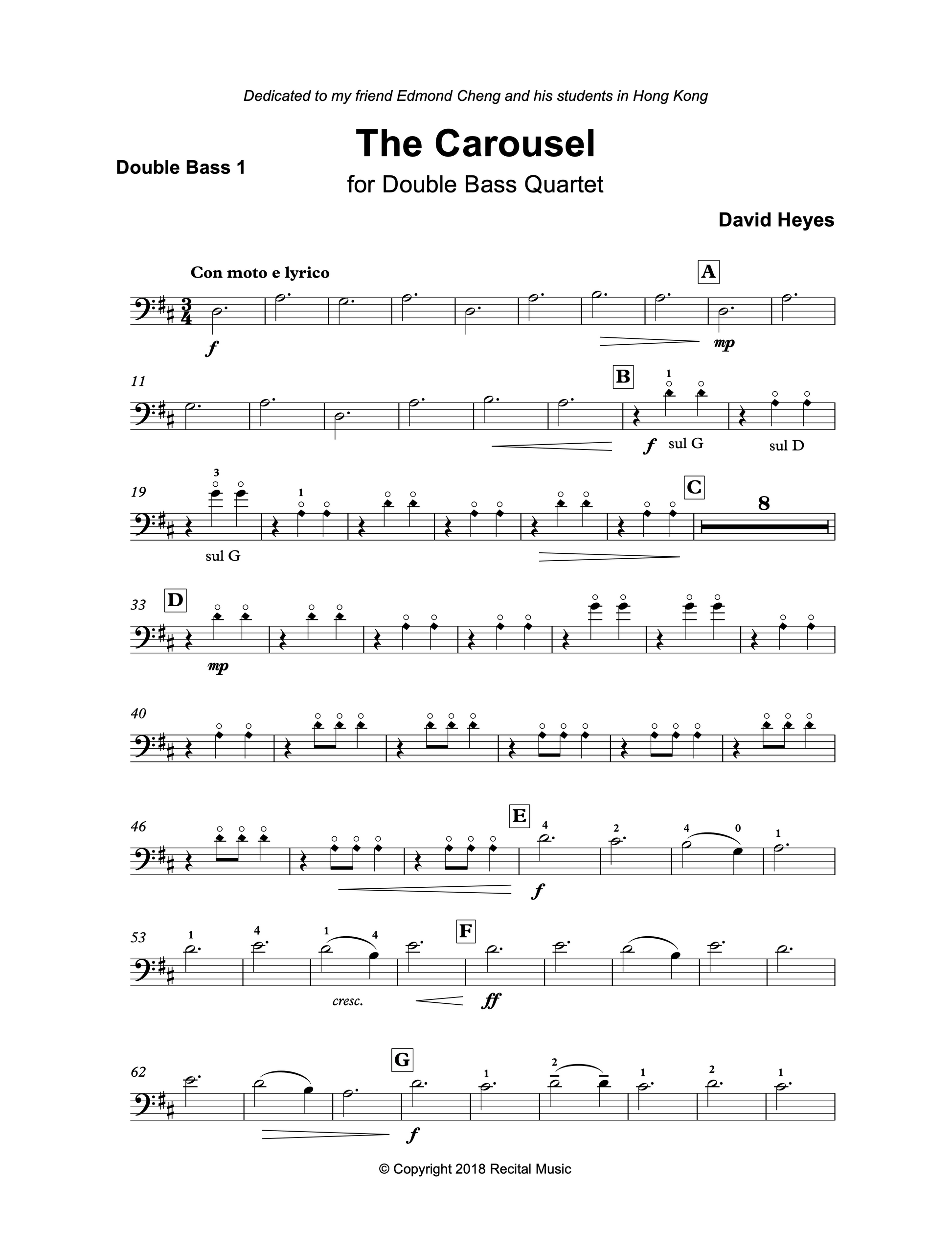 The Carousel was composed for junior double bass quartet or ensemble and only uses 1st and 4th positions, alongside G harmonic and two notes in 3rd position for bass 1. Each part has been carefully written for a specific ability level offering a range of musical and technical challenges for each bassist and the work is playable by quartet or larger forces.