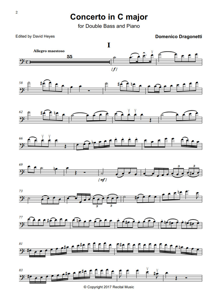 Dragonetti's Concerto in C major is a charming and accessible three-movement work and ideal for the good intermediate bassist. The first movement is longer than the other two movements combined and is similar to Cimador's Concerto in G major in terms of structure and level of difficulty.