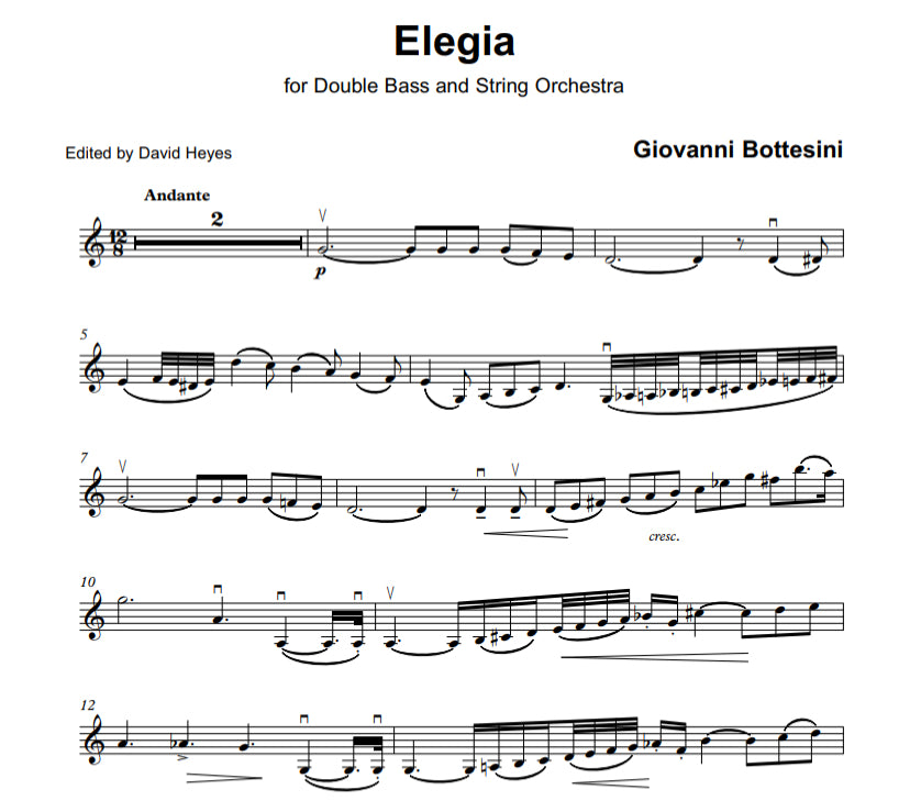Bottesini's Elegia is a staple of the solo double bass repertoire and is one of the most popular solo works in the repertoire. It has been recorded more than any other double bass piece and was rumored to be one of Bottesini's favorite works. The challenges are both musical and technical and demonstrate the lyrical and sonorous potential of the solo double bass.