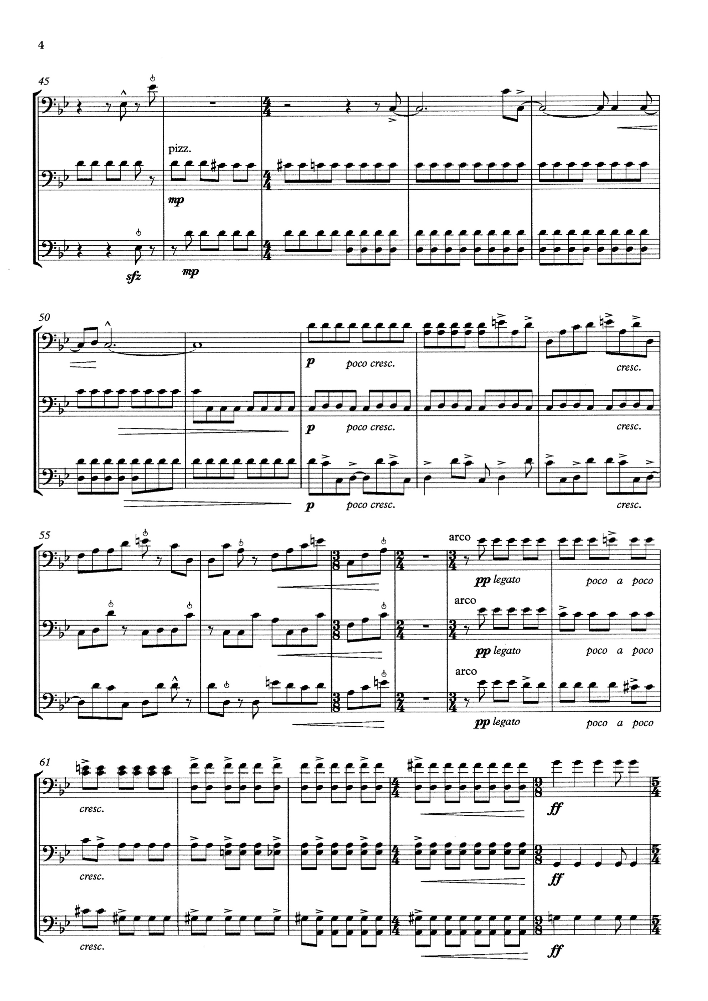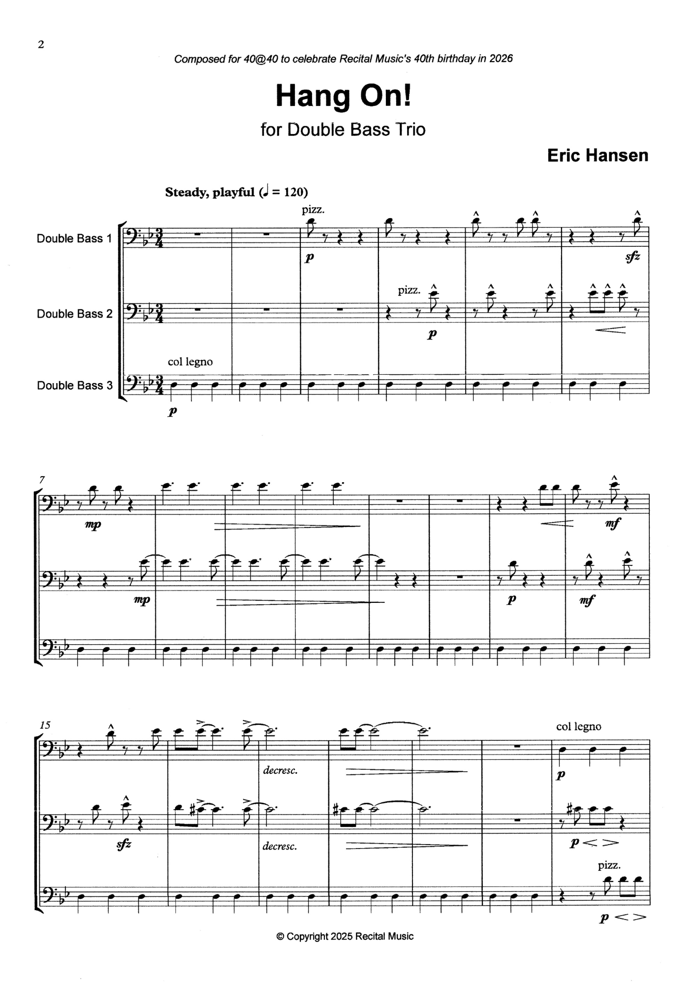 Hang On! is an exciting, vibrant and rhythmically charged piece, remaining in bass clef throughout, which would be ideal for the intermediate double bass trio. Different playing effects add colour and contrast, alongside multiple time changes which create energy pushing the music to a powerful and positive conclusion.