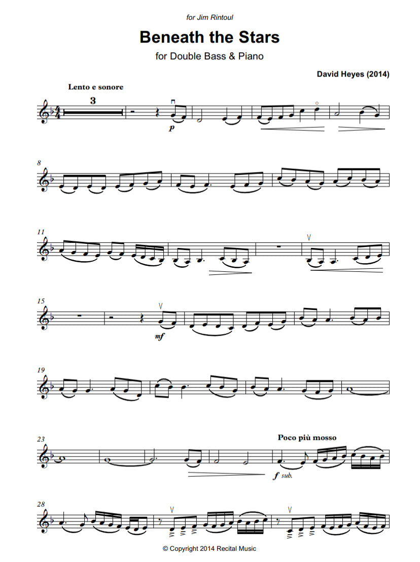 "Beneath the Stars was written in 2014 for double bassist James Rintoul. Inspired by the first movement of Frank Proto’s Sonata ‘1963’ the piano accompaniment only uses two chords, expanded within a series of rhythmic variations, echoing the simplicity and soporific effect of Satie's evocative Gymnopédie. The solo line is lyrical and song-like, emphasising the cantabile qualities of the double bass, contrasted by a more urgent and impassioned middle section before the music falls away into a recapitulation of the gently moving chordal introduction. Beneath the Stars was composed to commemorate the centenary of the start of the First World War with the idea that the stars look down on everyone... friend or foe alike!" [David Heyes]