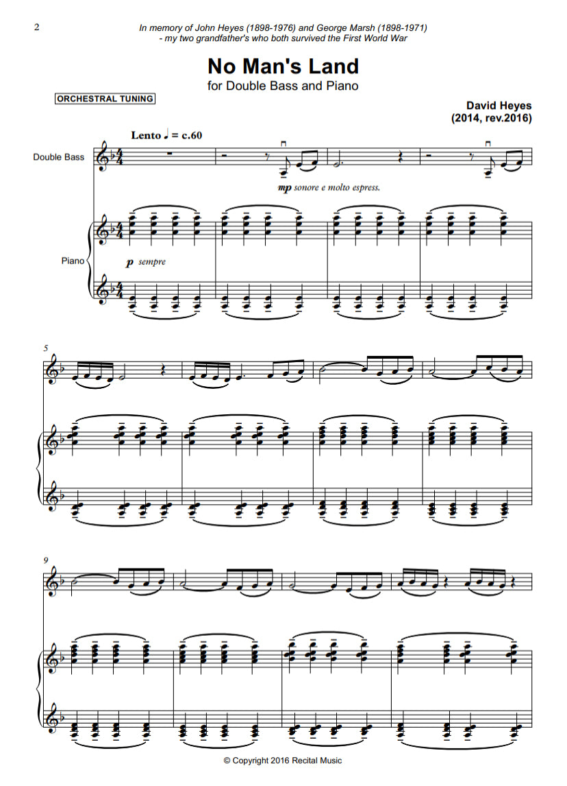 "When I was writing the piece I had a picture in my mind of the devastation of No Man's Land in front of me, in black and white, and the stillness and silence are depicted by the slowly moving chordal accompaniment. The solo double bass is almost an onlooker or observer who comments, with both sorrow and anger, at the sheer waste of human life and the brutality of 'a war to end all wars', and still we don't learn." [David Heyes]