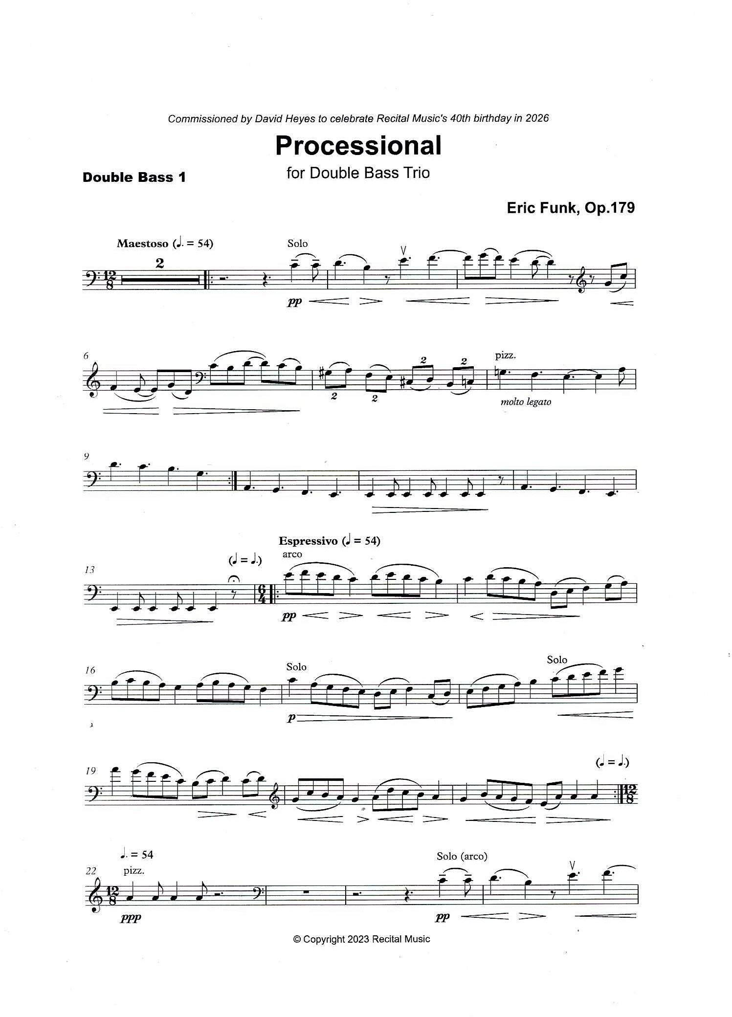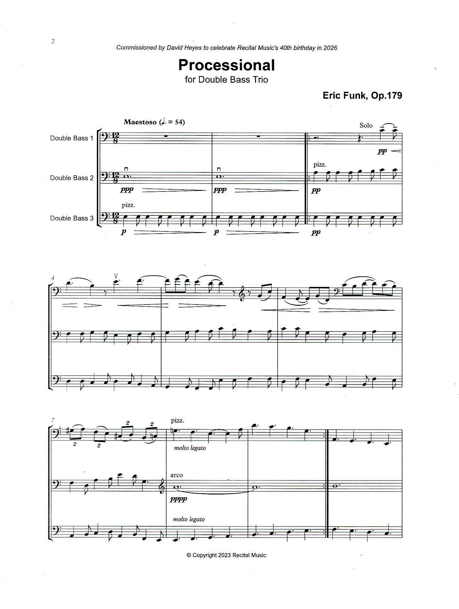 Processional is a colorful and evocative one-movement work that is aimed at the intermediate bass trio. Primarily using the middle and lower register, the music is inventive and rhythmically engaging with few technical challenges but much to enjoy.