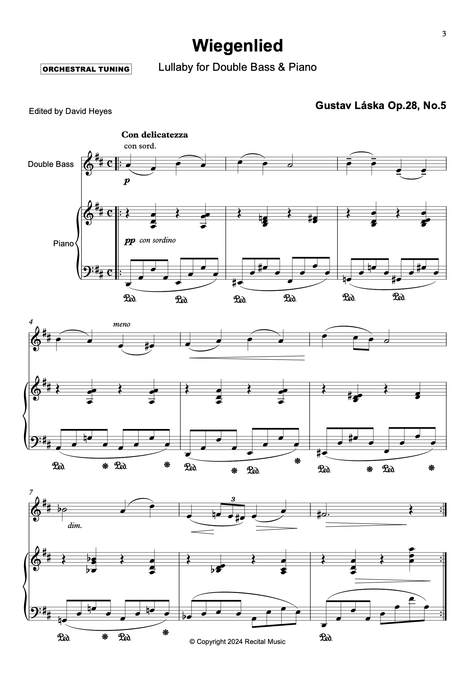 Gustav Láska (1847-1928) - Wiegenlied (Lullaby) Op.28, No.5 Wiegenlied (Lullaby) is a short and lyrical salon work and is the final work of Op.28, a suite of five pieces for violoncello or double bass and piano. First published in Leipzig in 1892, it was recorded by Serge Koussevitsky in 1929 but not released until 1949. Almost exclusively in treble clef and in the solo register of the double bass, Wiegenlied demonstrates the beautifully sonorous and cantabile qualities of the instrument.