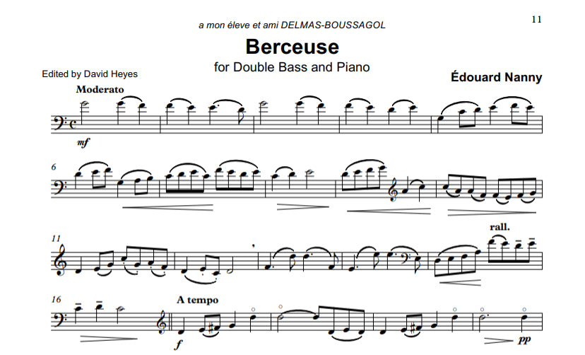 Édouard Nanny (1872-1942) was the leading French bassist of his generation, taught at the Paris Conservatoire for 20 years, and is recognized as the founder of the modern French double bass school. Alongside a wealth of transcriptions for double bass, Nanny also composed a series of original works which are worthy of revival in the 21st-century. His music is elegant and charming, exploiting the lyrical and technical possibilities of the double bass, and all are useful as both study and concert repertoire for the progressing bassist.