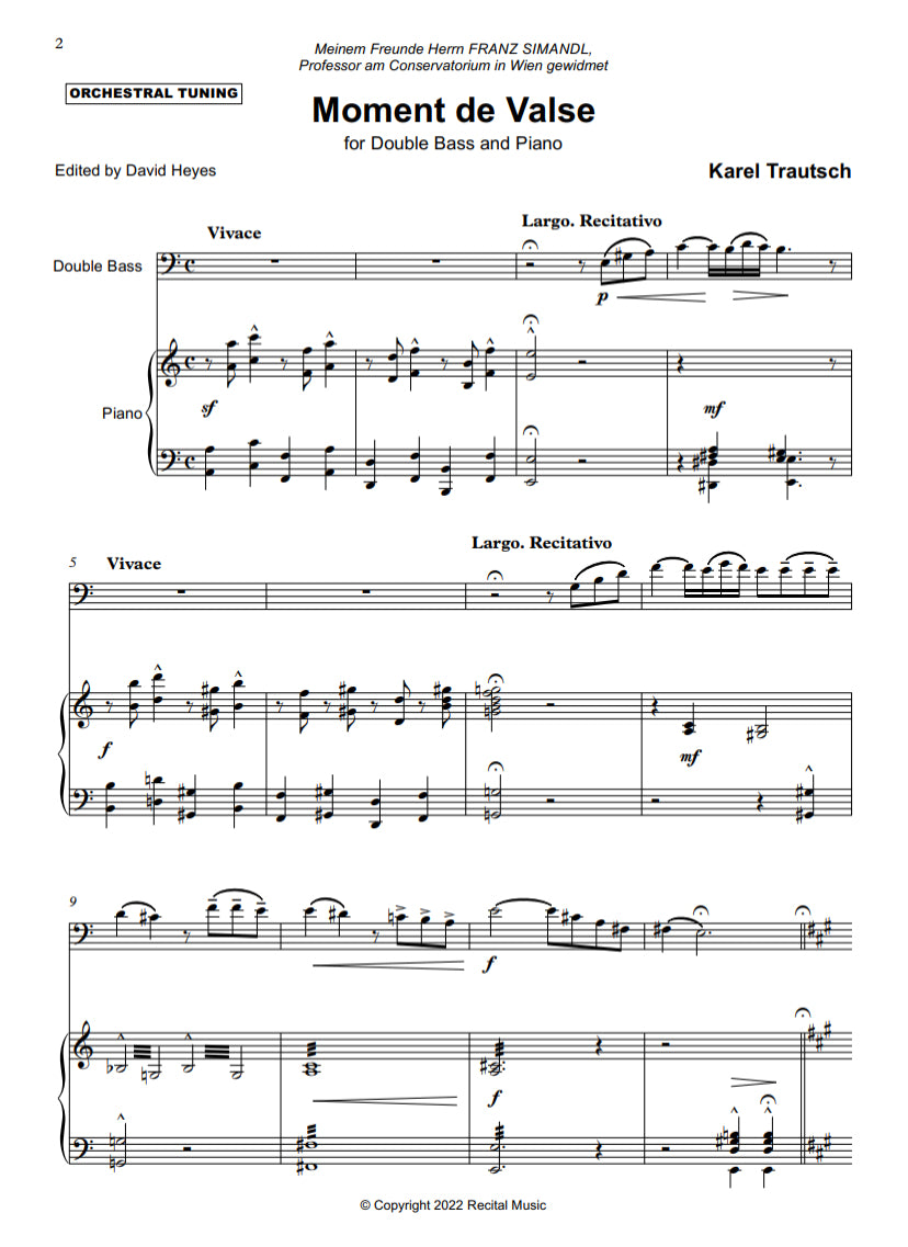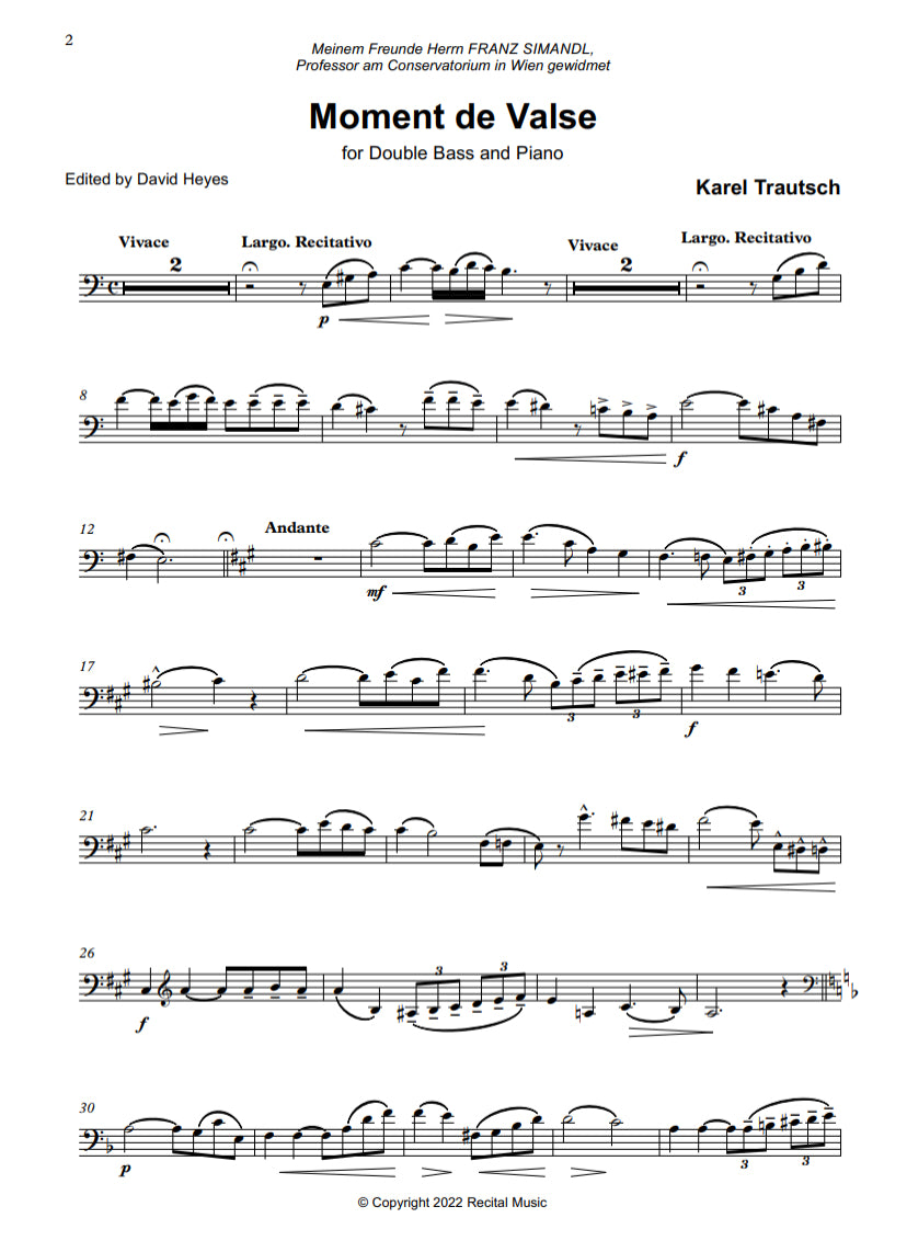 Moment de Valse is dedicated to Simandl and was first published in 1903 in Book 4 of Simandl’s 'High School for Double Bass - Advanced Course' - a series of 49 original works and transcriptions from some of the leading double bassists of the day published by C.F. Schmidt (Germany). In one extended movement, Moment de Valse is delightful and elegant, emphasising the musical and technical possibilities of the double bass, throughout its solo register. The style and grandeur of the Viennese waltz is captured throughout this enchanting, but mostly forgotten, solo.