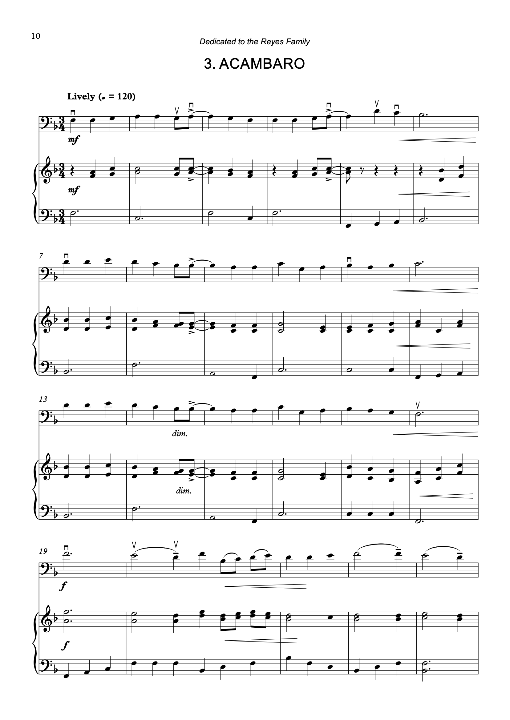 4. The flavor of Calle Ocho (8th Street) in old Miami is reminiscent of the Cuba of yesteryear, and the Afro-Caribbean music of my youth is still heard on every corner. This piece features a sustained melody in the bass accompanied by a more rhythmic underpinning in the piano accompaniment.