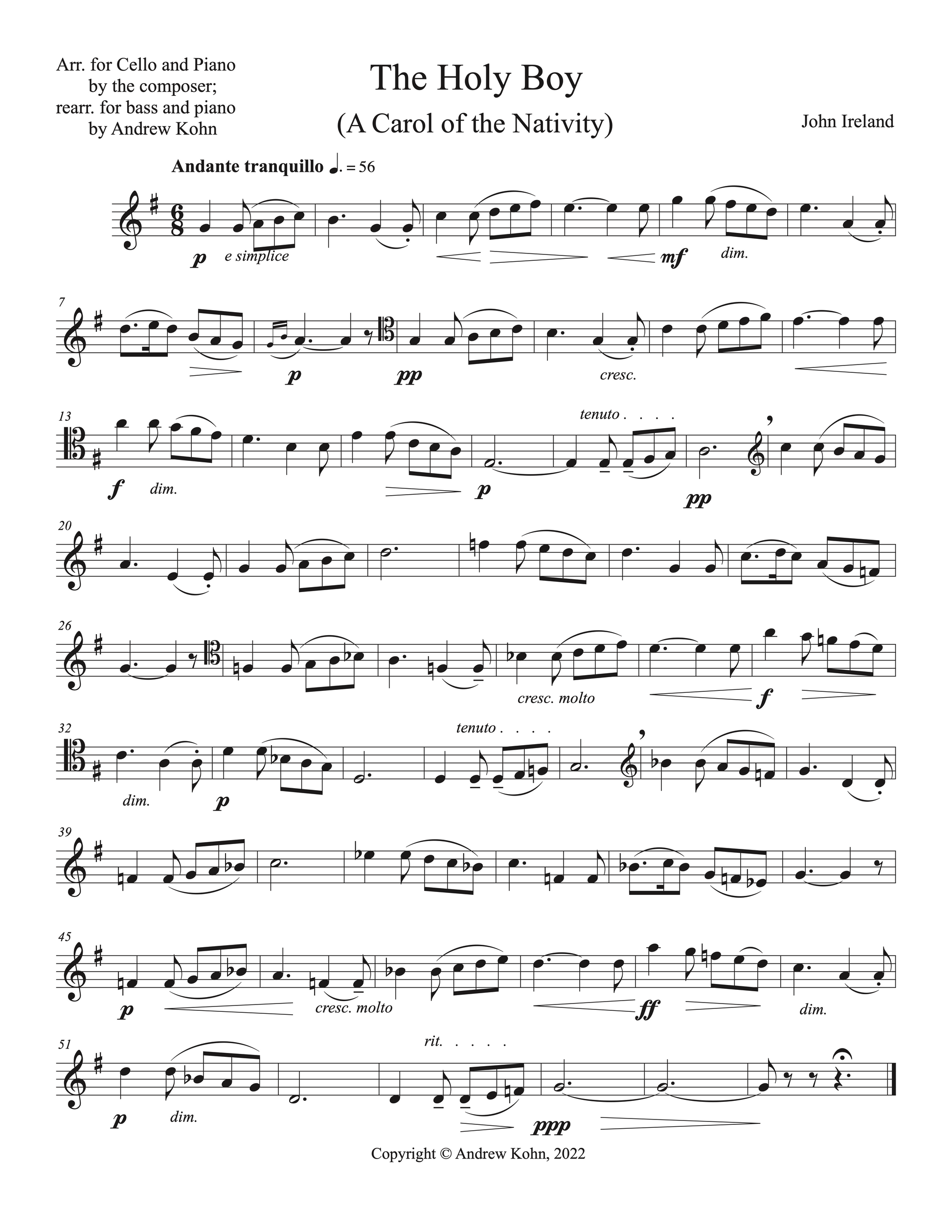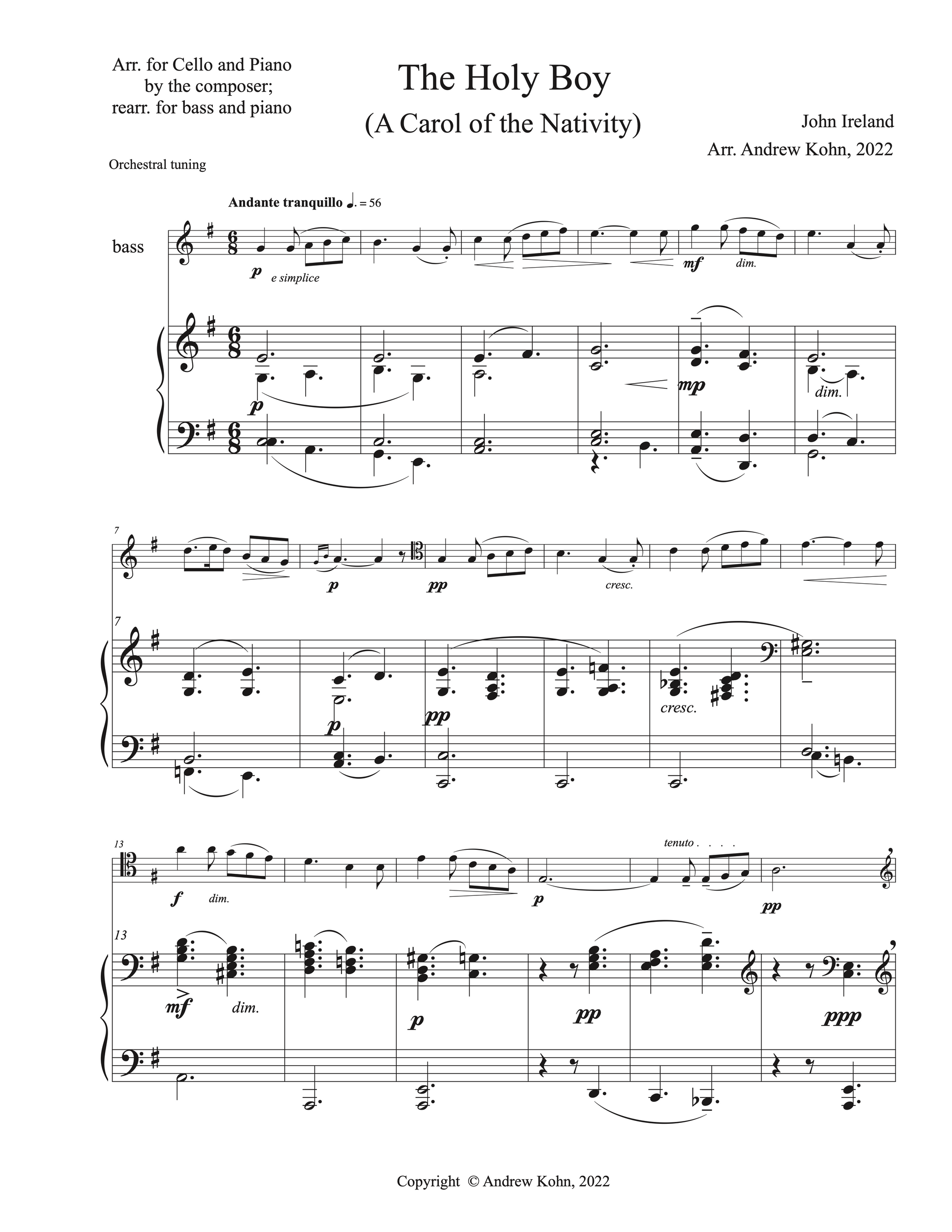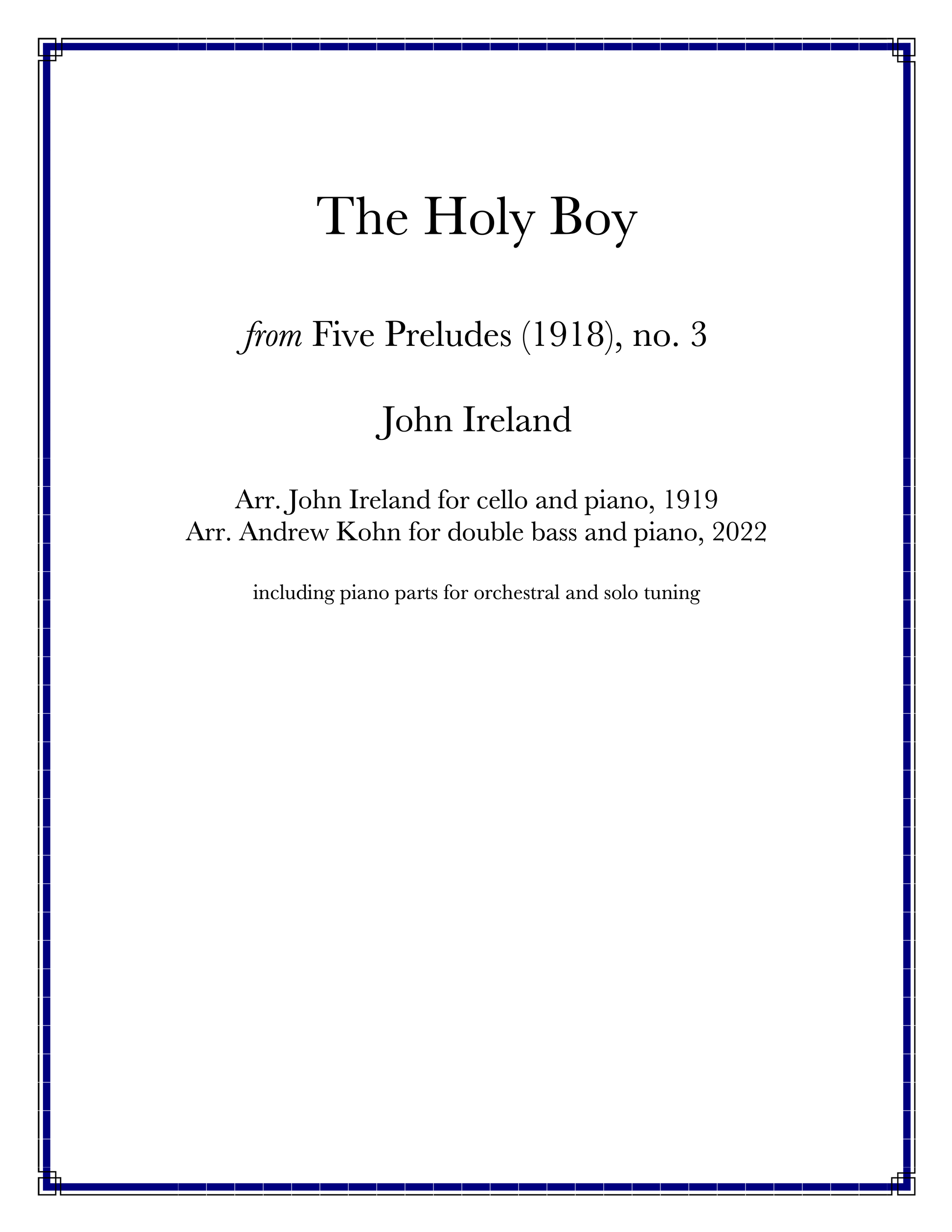 The Holy Boy is a tender, contemplative piece originally composed by John Ireland as a piano solo in 1913, later arranged by the composer for various instruments including cello and piano. This arrangement is beautifully adapted by Andrew Kohn for double bass and piano. The work captures a serene, devotional quality with its gentle melody and impressionistic harmonies, evoking the innocence and reverence suggested by its title.
