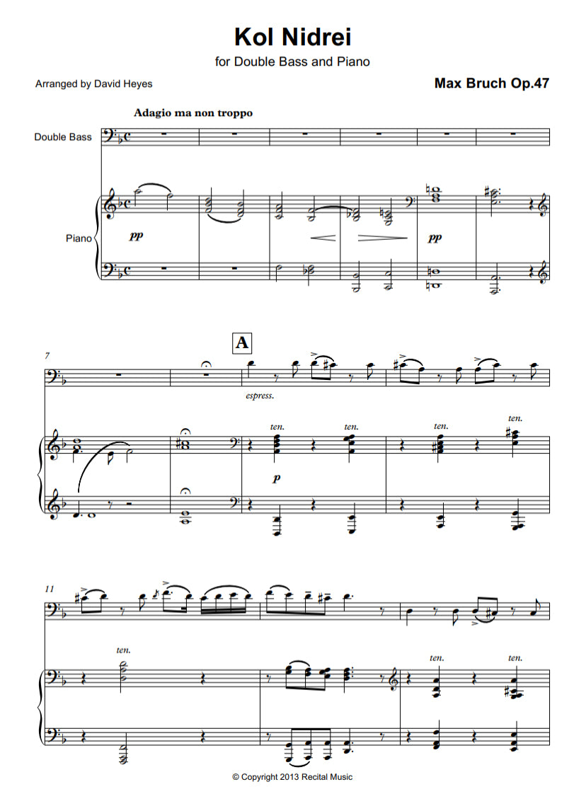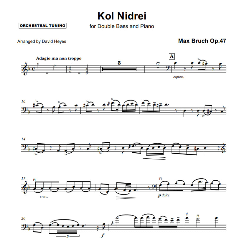 Kol Nidrei has long been one of Bruch's most popular works and has become standard repertoire for double bass throughout the late 20th-century. The composer also arranged the work for a number of instruments, including violin, and the present edition for double bass was edited by David Heyes for a series of his own chamber music recitals to demonstrate the soulful and cantabile qualities of the solo double bass.