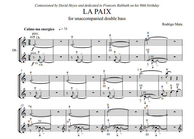 "La Paix" is a work dedicated to the legendary double bass player, pedagogue, and composer Francois Rabbath, who throughout his career has made a great musical contribution in different ways both in his teaching techniques, his compositions, and his multiple recordings of excellent quality.