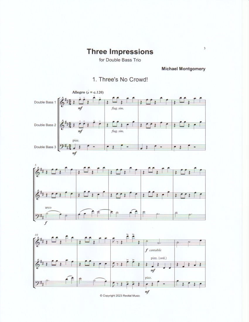 Three Impressions is a colourful and accessible trio of pieces for three double basses. Playable as a suite, singly or in any order, these attractive and engaging pieces are ideal for the progressing bass and ideal for any audience or occasion.
