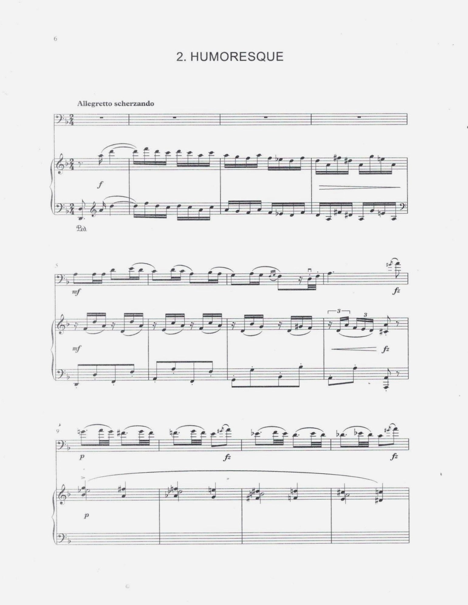 Romance is lyrical and evocative, contrasting a livelier and playful Humoresque. The piano accompaniments are supportive and independent, full of late-romantic bravura and rhythmic invention, and the pieces can be successfully performed singly or together as a suite.