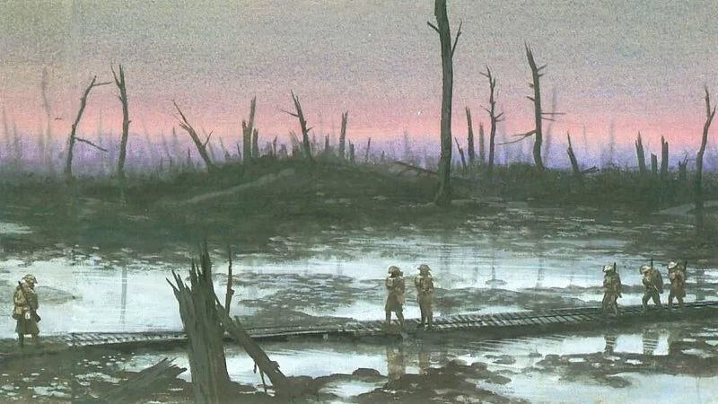 Passchendaele - a Meditation for 2 double basses and piano was inspired by an iconic photograph of Australian gunners on a duckboard track in Château Wood near Hooge taken by by Frank Hurley on 29 October 1917.