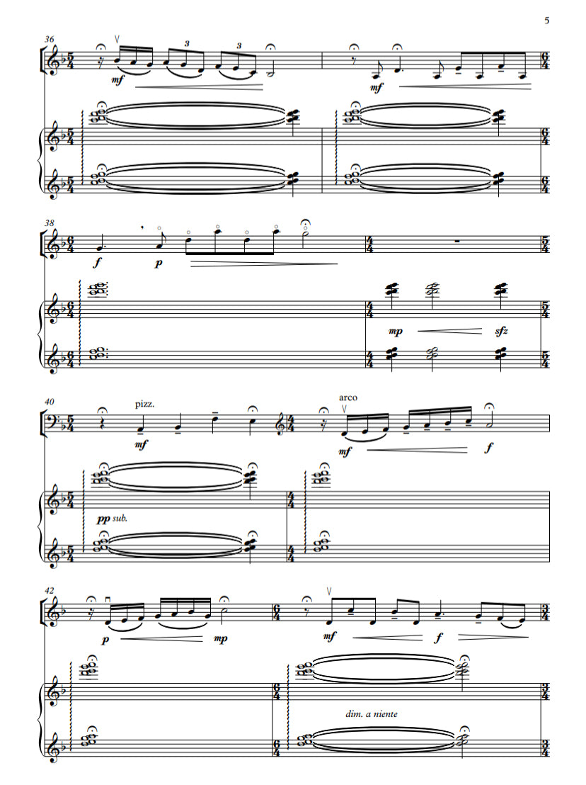 The music is simple and slow-moving, contrasting strong and powerful emotions from the two soloists, set against a simple and repetitive accompaniment that subtly underpins the melodic lines. There are opportunities to display the lyrical and sonorous qualities of the double bass, whether as a duet or in the two solo soliloquies, which eventually die away into nothingness and into the mists of time.