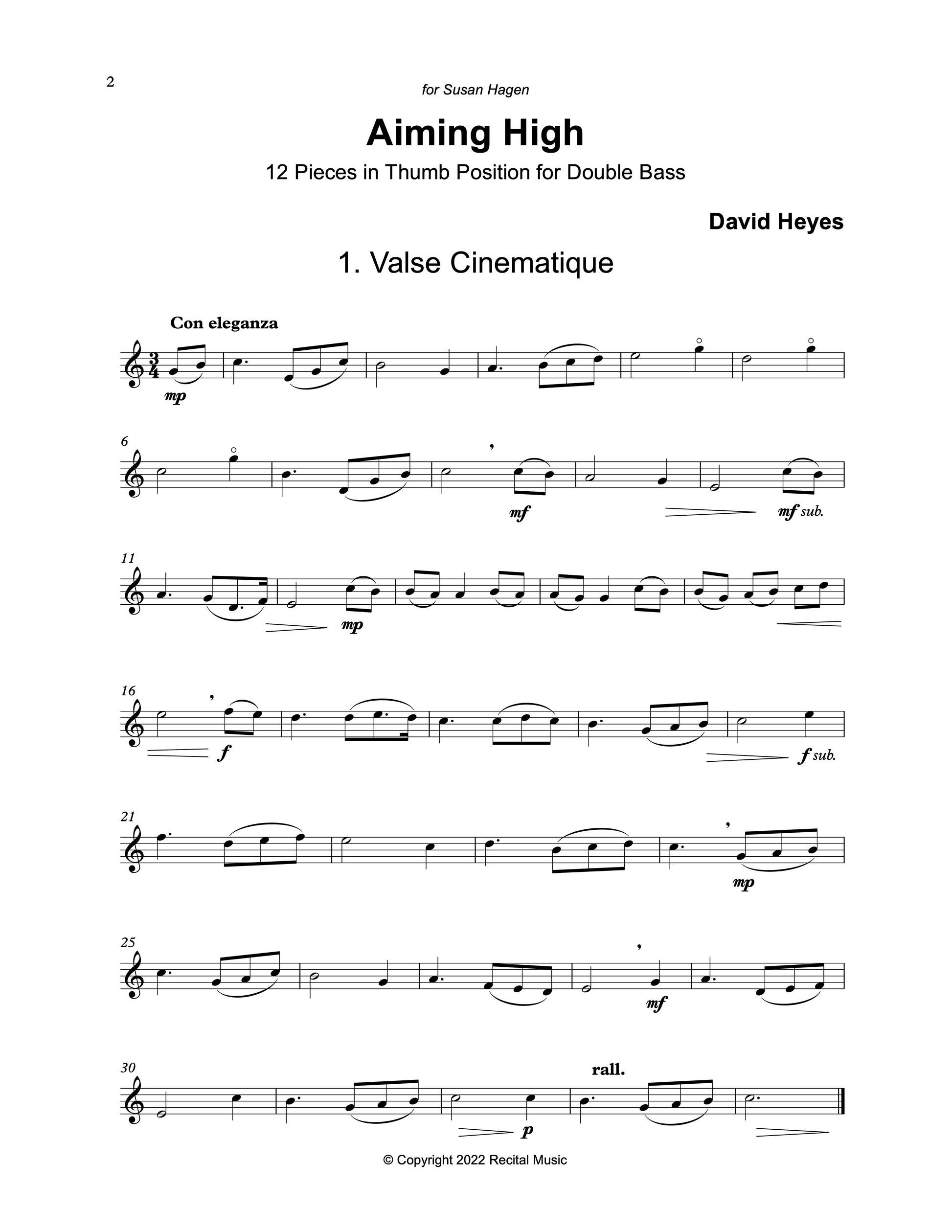 Aiming High is a set of twelve melodic and inventive pieces in thumb position for the advancing double bassist, each in a different key. The challenges are musical and technical in equal measure, in a range of styles, with a few harmonics and false harmonics added to create variety and contrast. Scale and arpeggio figures help to consolidate a sense of tonality in the higher register and each piece can be played successfully with a range of fingering patterns and hand shapes.