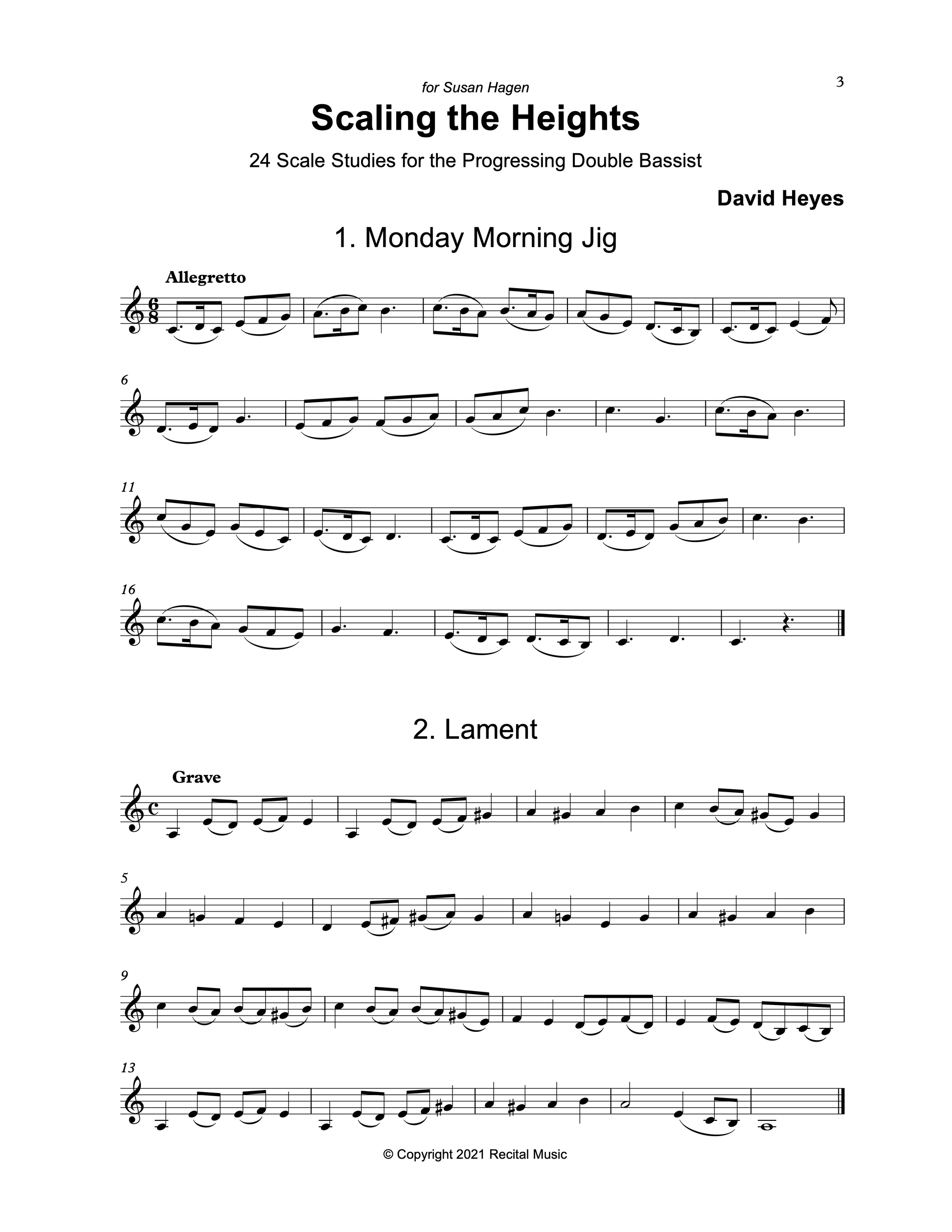I enjoy writing music for my students and many friends and Susan Hagen has been an amazing friend and supporter, as soloist and commissioner. The most recent commission from Susan is Scaling the Heights. The brief was for music that moved into and out of thumb position, always challenging for young bassists, and I realized that a short piece in each major and minor key would be the right approach - 24 pieces in all. I started with C major and went through all the sharp keys, then the flat keys ending with D minor, my favorite key.