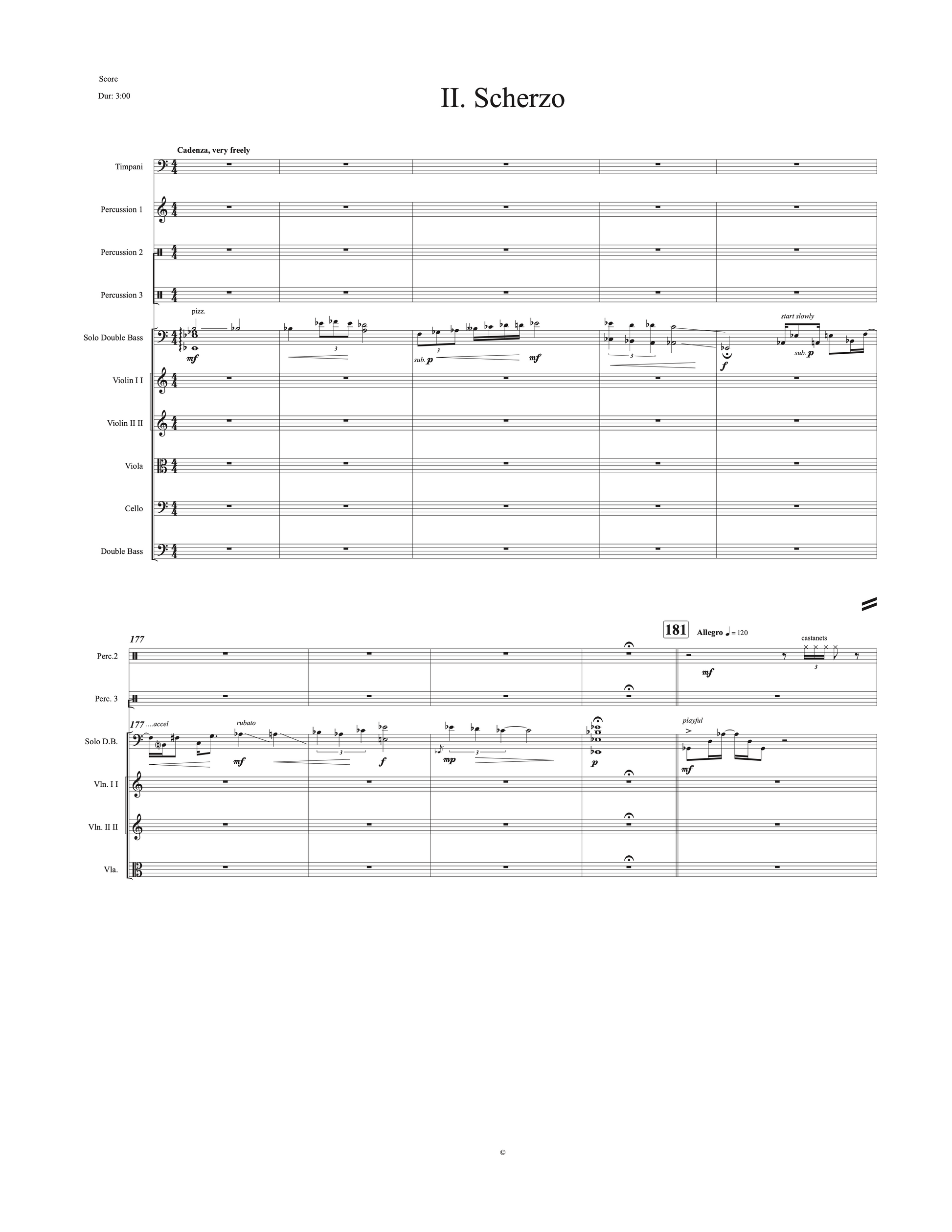 The Pesante feroce is the high-energy climax of the piece. Short, driving, accented motives are tossed between the bass and the orchestra. The music is often somewhat dissonant, but always directional. A challenge in composing for bass is balance between the bass and the orchestra. Rather than thinning the orchestra, in this movement, I chose to have them alternate quickly, so the orchestra could play with fullness and energy without covering the bass. The middle of this movement slows to a dark, mysterious scene, with a persistent 4-note ostinato that is traded through the winds, brass, percussion, strings, and harp. Fairly quickly, the music returns to the virtuosic, driving bass themes, pushing toward the dramatic final repetition of the opening statement.