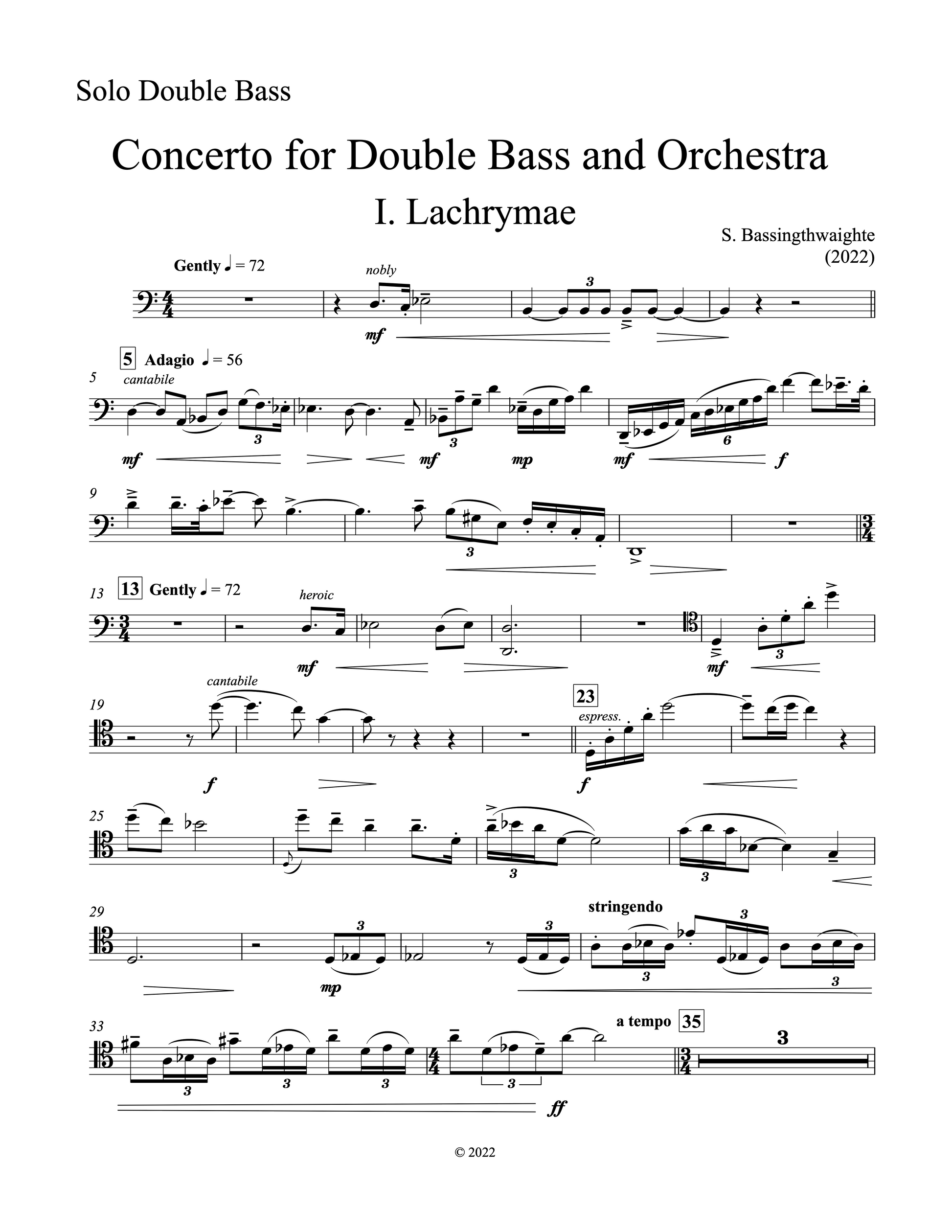 The Concerto is in three movements: Lachrymae, Scherzo, and Pesante feroce. The Lachrymae is the most serious and dramatic movement. Many composers have written movements called lachrymae or lacrimosa, referring to tears. The first of the three movements is the mournful Lachrymae; both the composer and the bassist for whom this was written had recently lost loved ones, which is represented by the teardrop motif (descending notes slurred in twos). The waves of the complex feelings of grief appear as velvety, lush low notes in the bass, as exquisite melodies in the harp and woodwinds, and in the heaviness of the brass. About a third of the way in, the piccolo shares a duet with the bass, who plays a haunting melody using only harmonics. The other primary motive in this movement is the stubborn melody introduced by the solo bass – it consists of a tiny range of a minor 3rd, with the center note reiterated repeatedly. This movement intensifies at a glacial, constrained rate, ultimately reaching a wailing climax; the orchestra then leaves the bass to mourn alone.