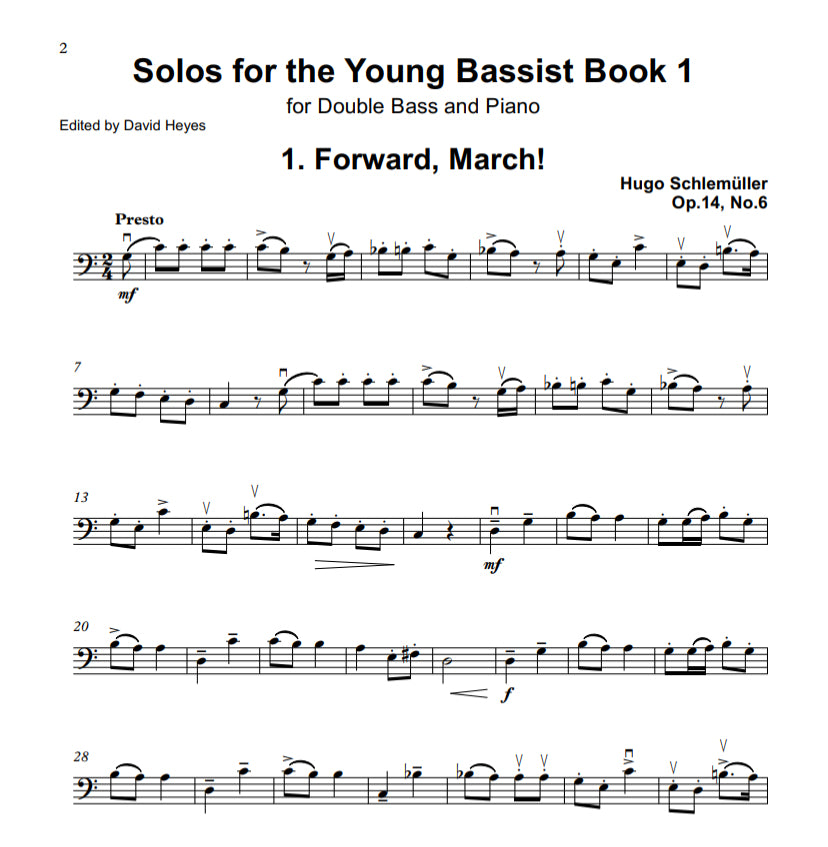Solos for the Young Bassist includes three fun and accessible pieces by Hugo Schlemüller. Originally for cello and composed in the late 19th or early 20th-century, they transcribe beautifully for the young bassist, offering musical and technical challenges in equal measure. The piano accompaniments are supportive and colorful adding rich sonorities and rhythmic interest.