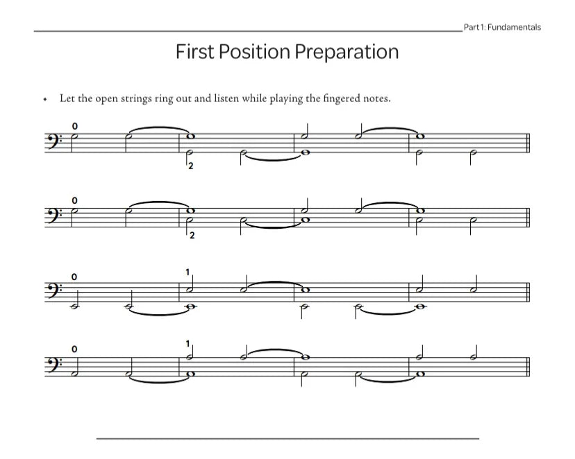 This book is a collection of things that I wished for as a teacher and as a player. These are warmups I love to play. These are exercises I would time and time again scribble out in terrible handwriting for students or give photocopied photocopies of old pages. These are references for straightforward scale fingerings and theory concepts that I think are most important and practical for bass players. This is not a comprehensive method book; it is supplemental material to the likes of Simandl, Rabbath, Portnoi, Petracchi, etc.