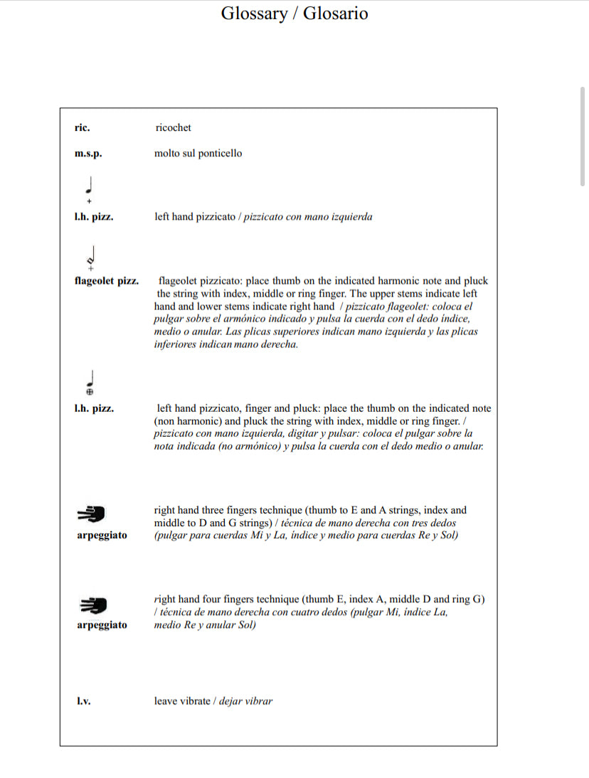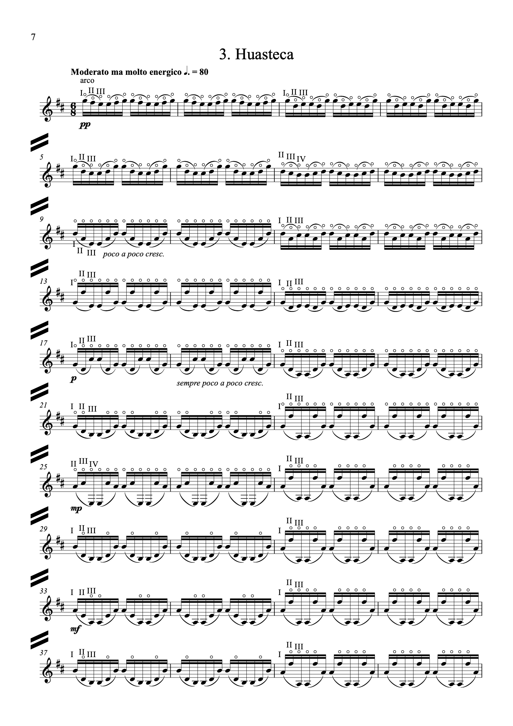 This dance is demanding in terms of the agility of the bow and the use of the high register, imitating a bit the phrasing of the violin huasteco. The piece is written in a very traditional tonal form, very simple measures and it introduces very peculiar techniques, such as the pizzicato flageolet, the pizzicato arpeggiato, the combination of natural harmonics with normal notes, among others.