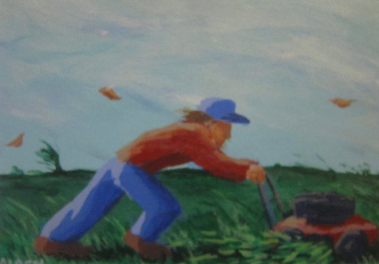 This piece recalls a summer job cutting grass in an old graveyard. They spent their breaks making up slogans for their business, "Orglawn of Hampden."