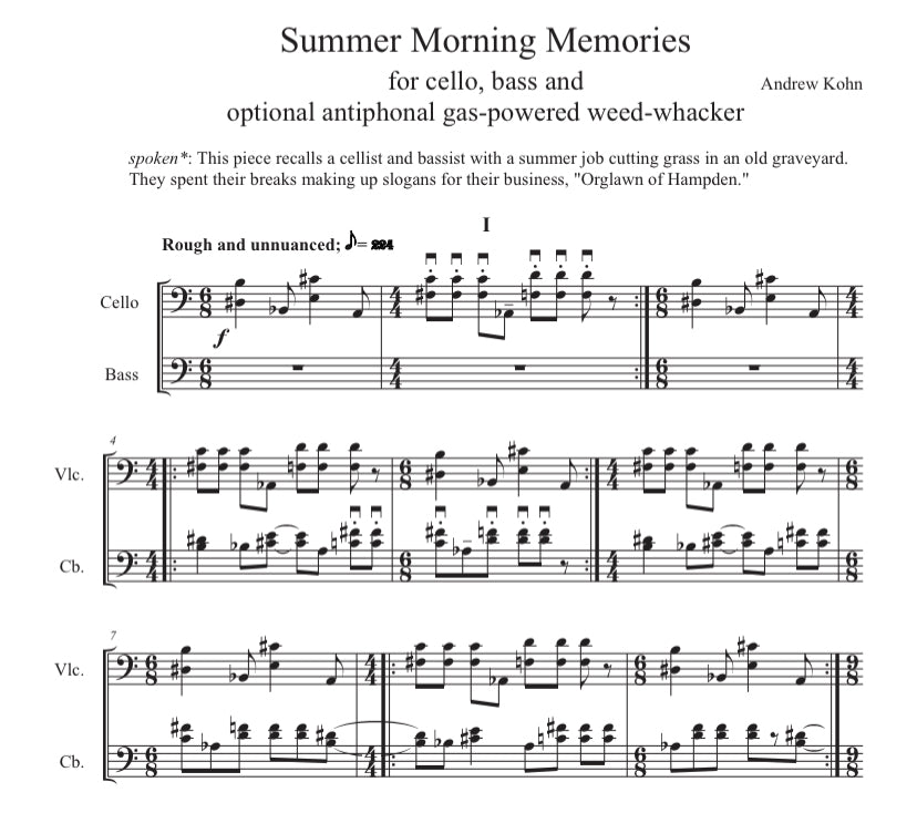 Composed by Andrew Kohn (Pittsburgh Opera, West Virginia University) for cello, double bass, and optional antiphonal gas-powered weed-whacker.