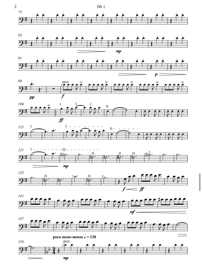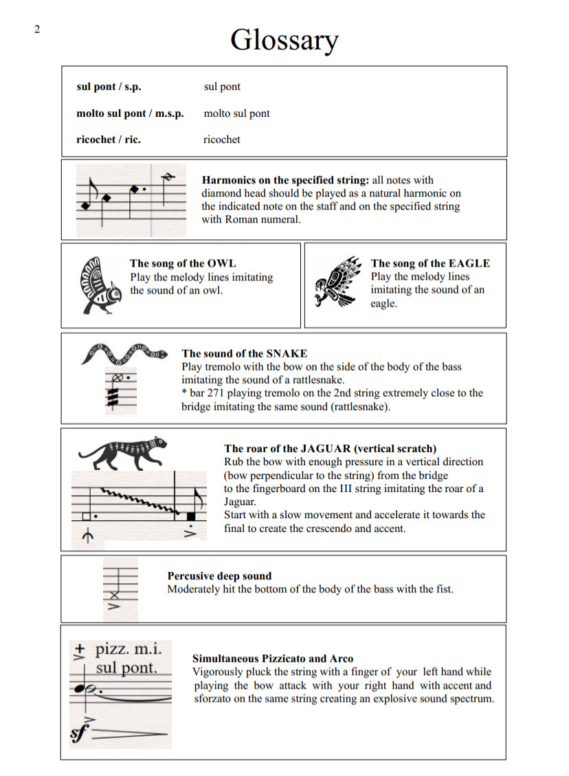 This piece takes the opportunity to introduce some unconventional double bass techniques that might seem strange, but turn out to be simple and fun, for example, the use of natural harmonics that can be played in the first positions of the left hand, the placement of the bow on the ponticello (bridge), the percussion on the body of the bass, the trill on harmonics or the scratch. In the same way, it uses more conventional techniques such as pizzicato, tremolo, glissando or ricochet.