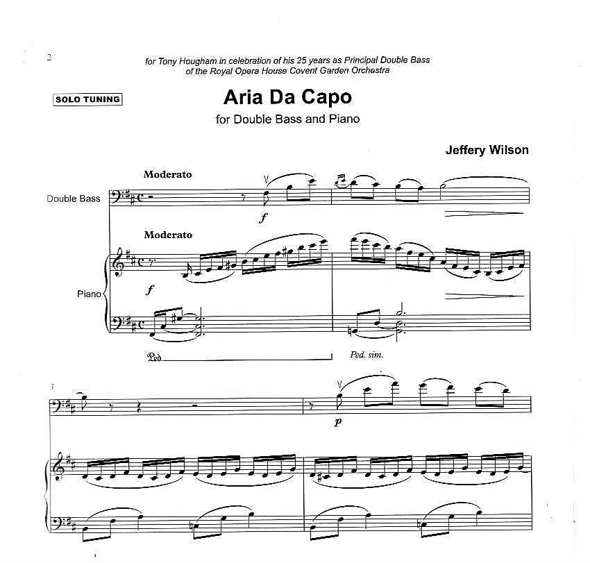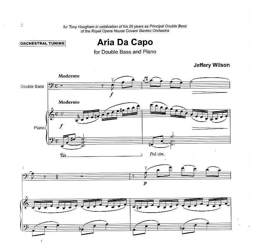 Jeffery Wilson writes: 'Aria da Capo was written for my dear friend Tony Hougham in celebration of his 25 years as principal Double Bass of the ROH Orchestra at Covent Garden. The 'operatic' form of the piece refers to the working environment of this fine musician and the music itself explores the lyrical qualities of this most expressive instrument.'